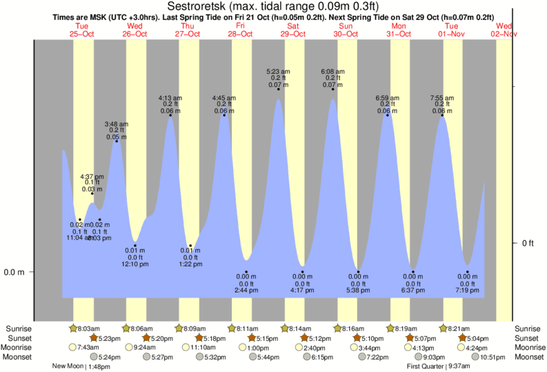 Tide Times are MSK (UTC +3.0hrs). Last Spring High Tide at Sestroretsk was on Sun 07 Dec (height: 0.08m 0.3ft). Next high Spring Tide at Sestroretsk will be on Sat 20 Dec (height: 0.07m 0.2ft).