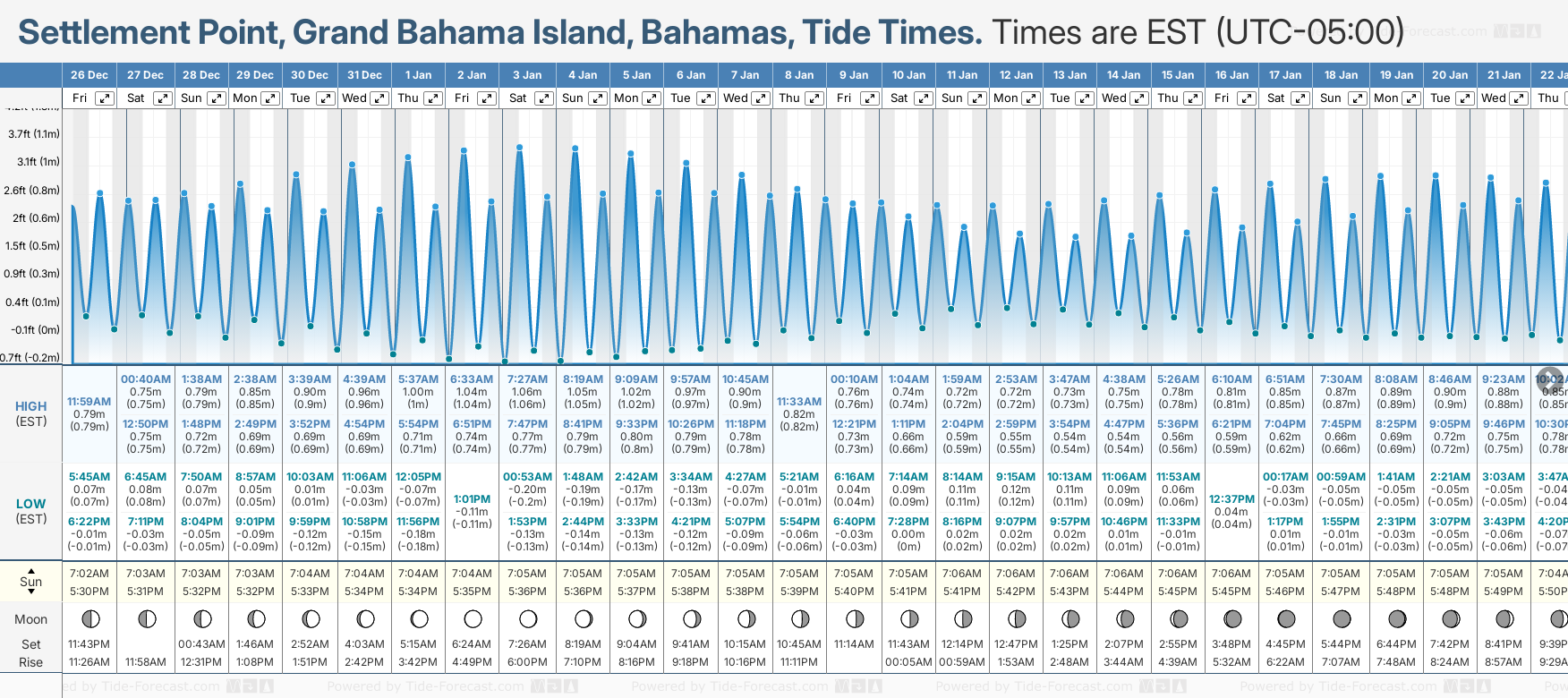 December and January Tide charts for Settlement Point, Grand Bahama Island: The tide charts below show the height, time and date of high and low tides for the next 30 days.
