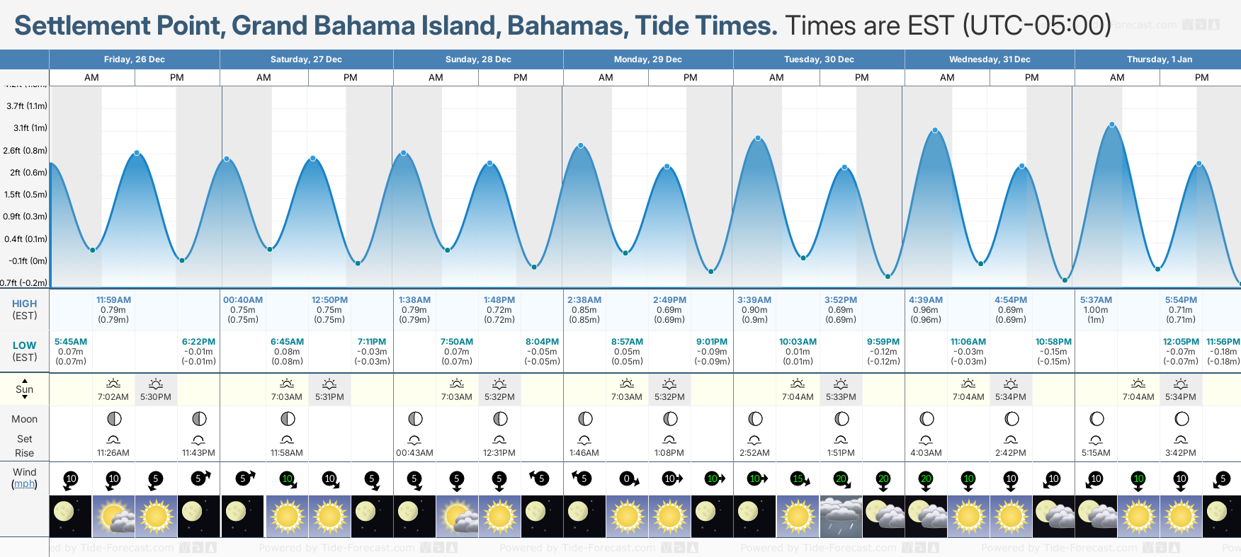 Tide Times are EST (UTC -5.0hrs). Last Spring High Tide at Settlement Point, Grand Bahama Island was on Mon 22 Dec (height: 0.89m 2.9ft). Next high Spring Tide at Settlement Point, Grand Bahama Island will be on Sat 03 Jan (height: 1.06m 3.5ft).