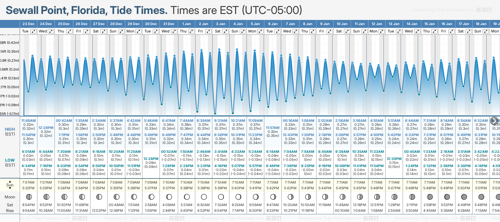 December and January Tide charts for Sewall's Point: The tide charts below show the height, time and date of high and low tides for the next 30 days.