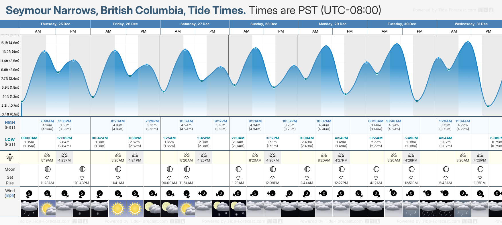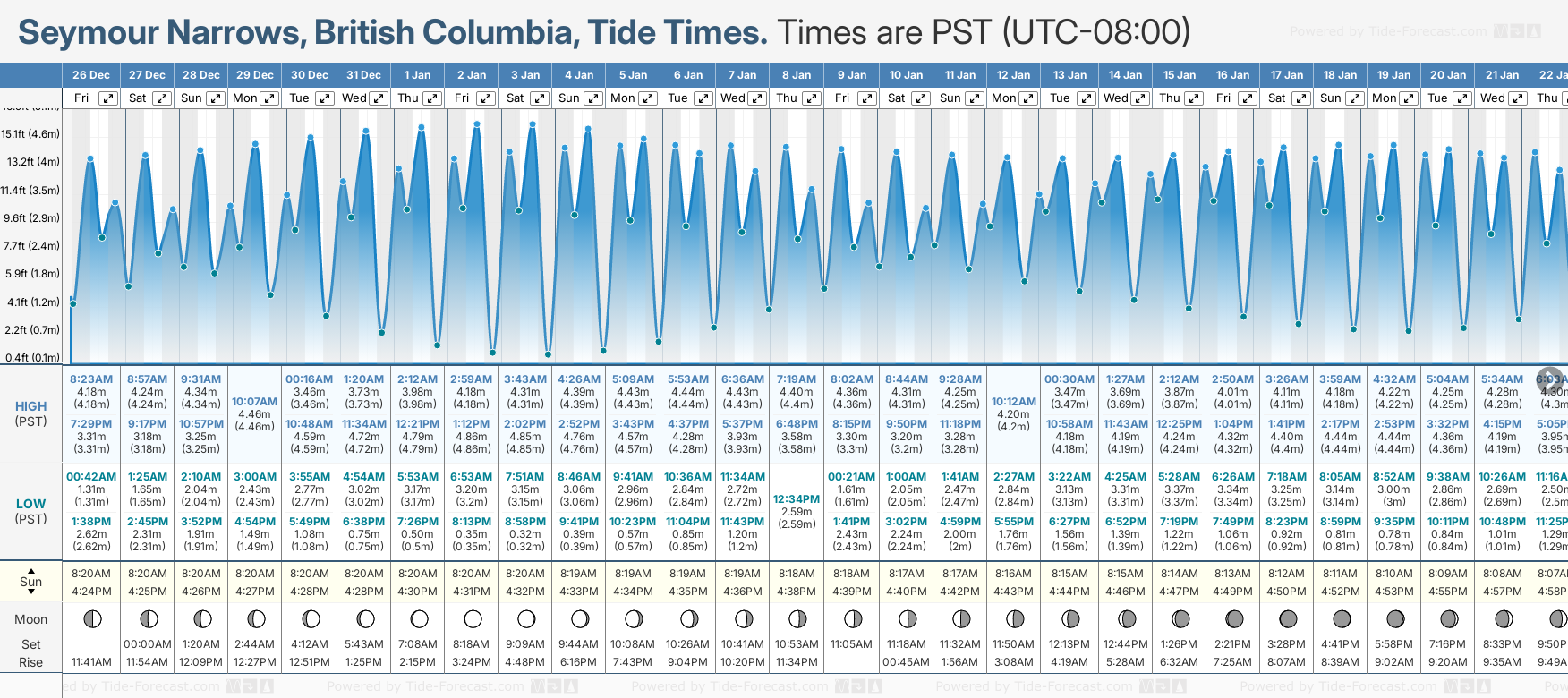 December and January Tide charts for Seymour Narrows: The tide charts below show the height, time and date of high and low tides for the next 30 days.
