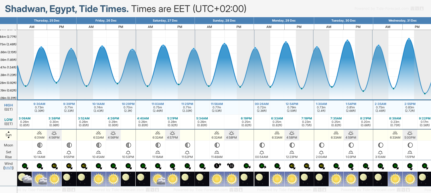 Tide Times are EET (UTC +2.0hrs). Last Spring High Tide at Shadwan was on Sun 21 Dec (height: 0.72m 2.4ft). Next high Spring Tide at Shadwan will be on Sat 03 Jan (height: 0.86m 2.8ft).