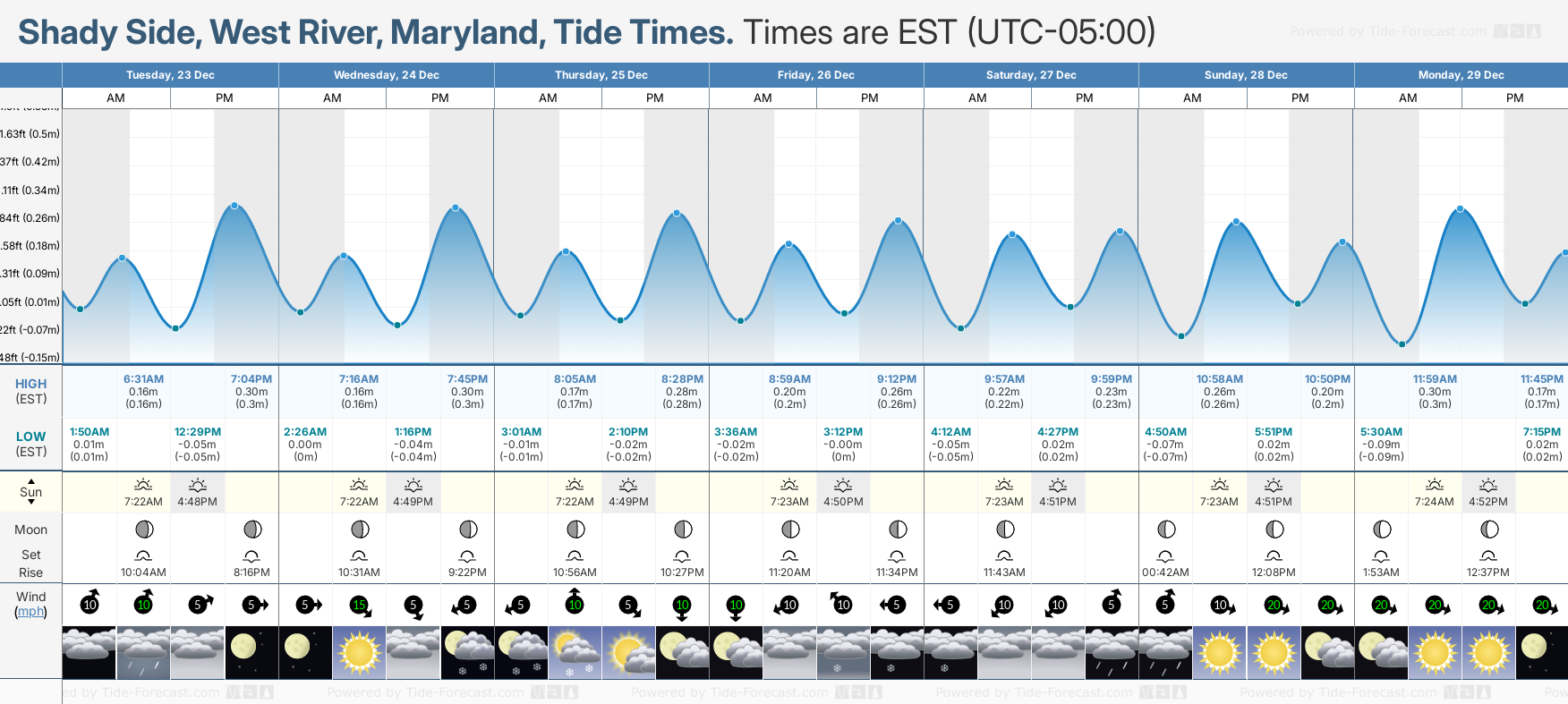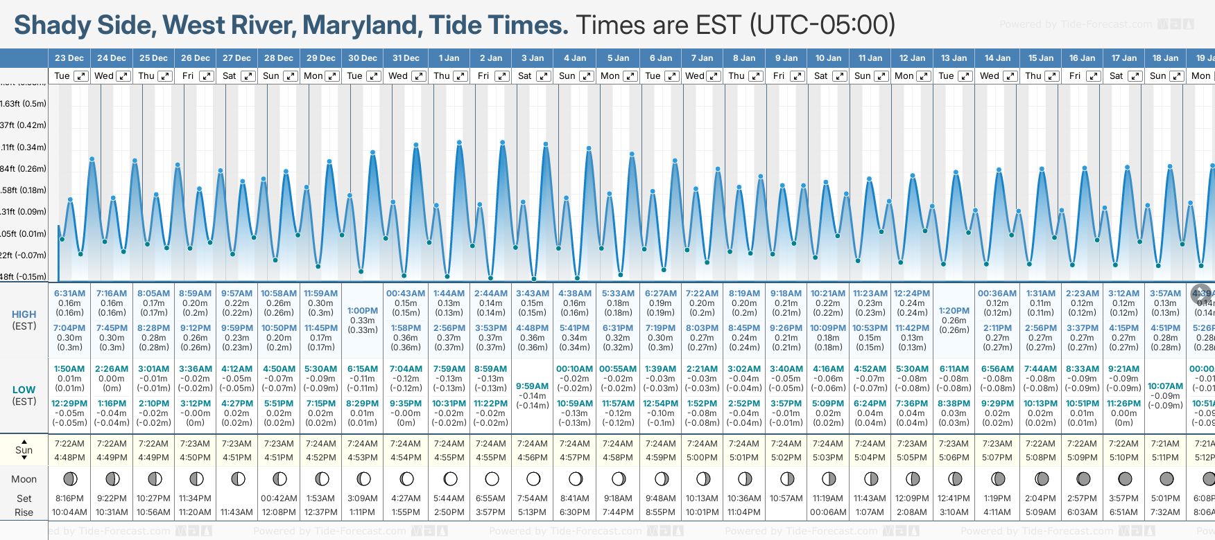 December and January Tide charts for Shady Side: The tide charts below show the height, time and date of high and low tides for the next 30 days.