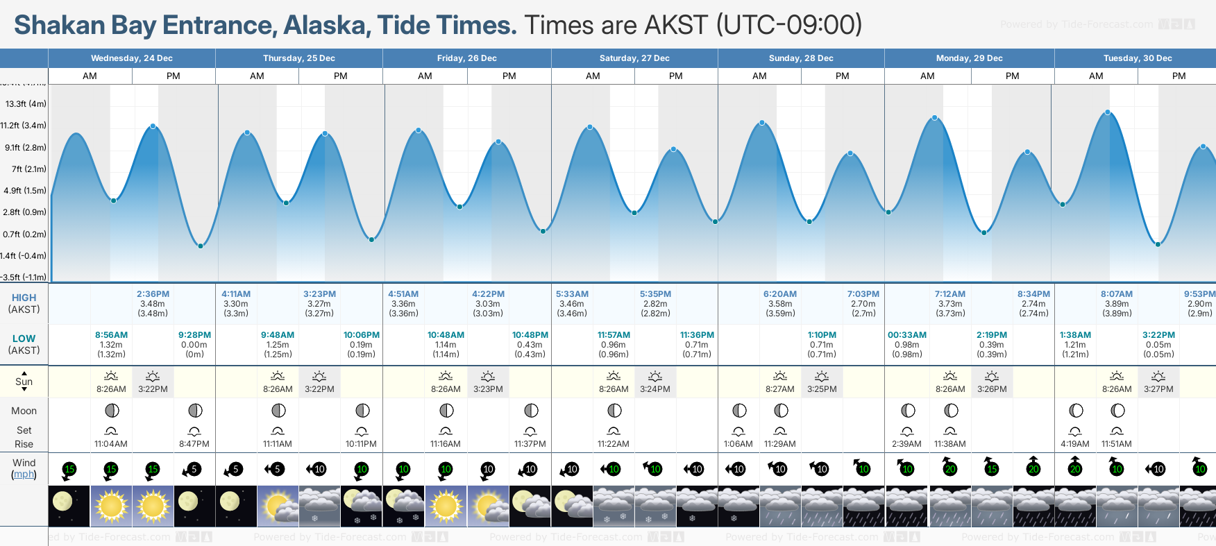 December and January Tide charts for Shakan Bay Entrance: The tide charts below show the height, time and date of high and low tides for the next 30 days.