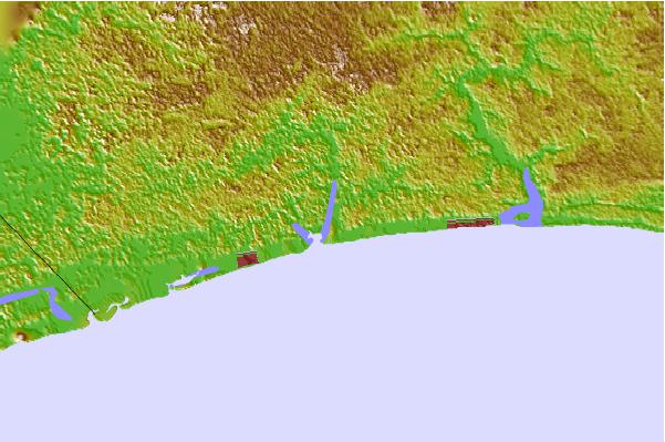 Use this relief map to navigate to tide stations, surf breaks and cities that are in the area of Shallotte Inlet (Bowen Point), North Carolina.