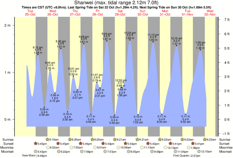 Tide chart for ShanweiShowing low and high tide times for the next 30 days at Shanwei. Tide Times are CST (UTC +8.0hrs).