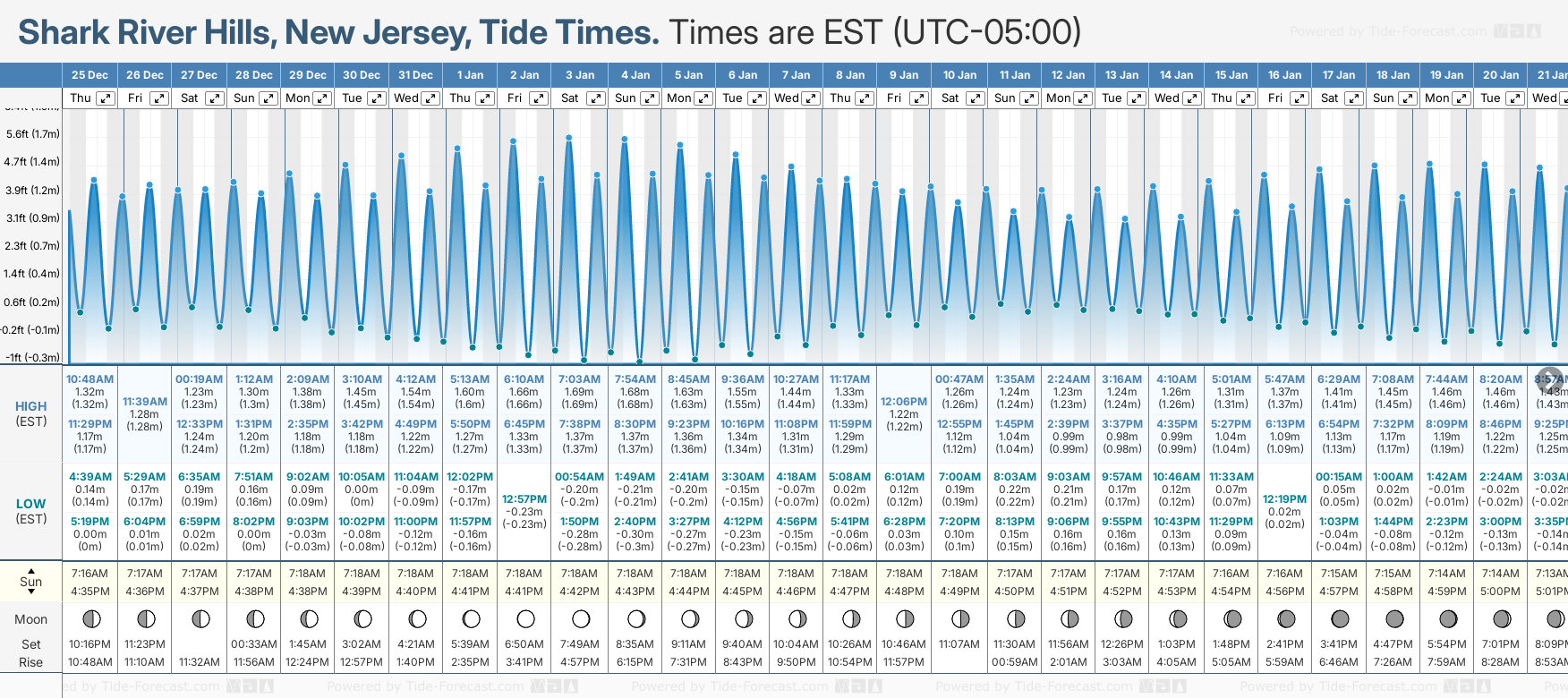 Tide chart for Shark River HillsShowing low and high tide times for the next 30 days at Shark River Hills. Tide Times are EST (UTC -5.0hrs).