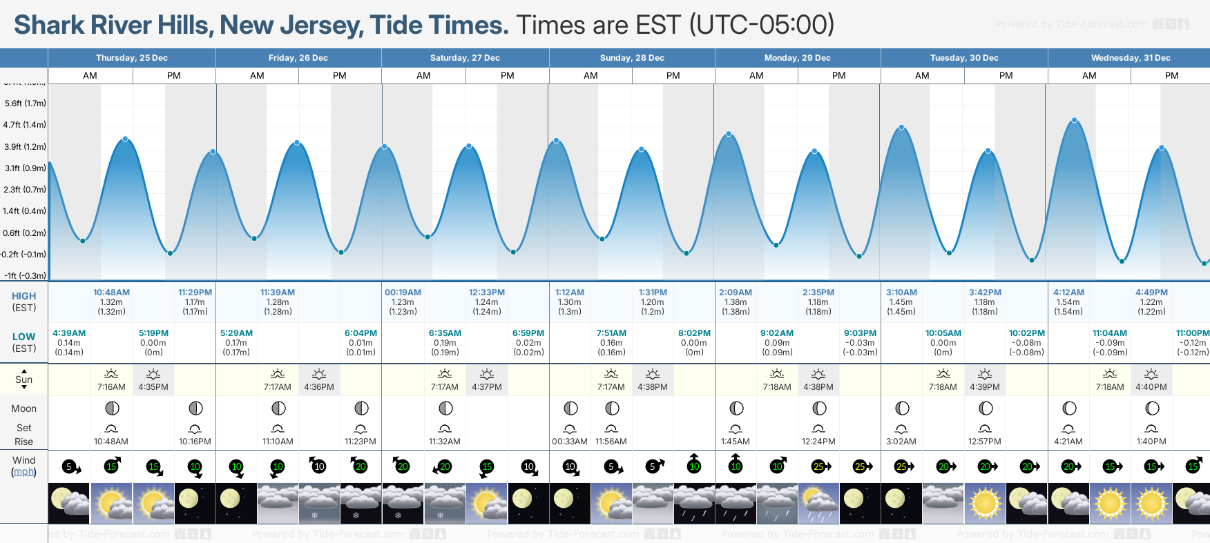 December and January Tide charts for Shark River Hills: The tide charts below show the height, time and date of high and low tides for the next 30 days.