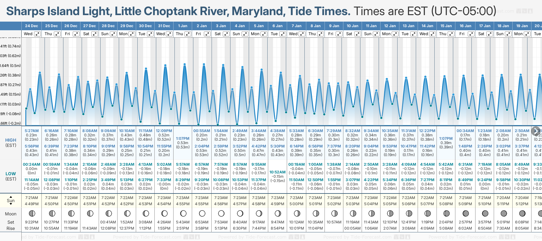 December and January Tide charts for Sharps Island Light, Little Choptank River: The tide charts below show the height, time and date of high and low tides for the next 30 days.