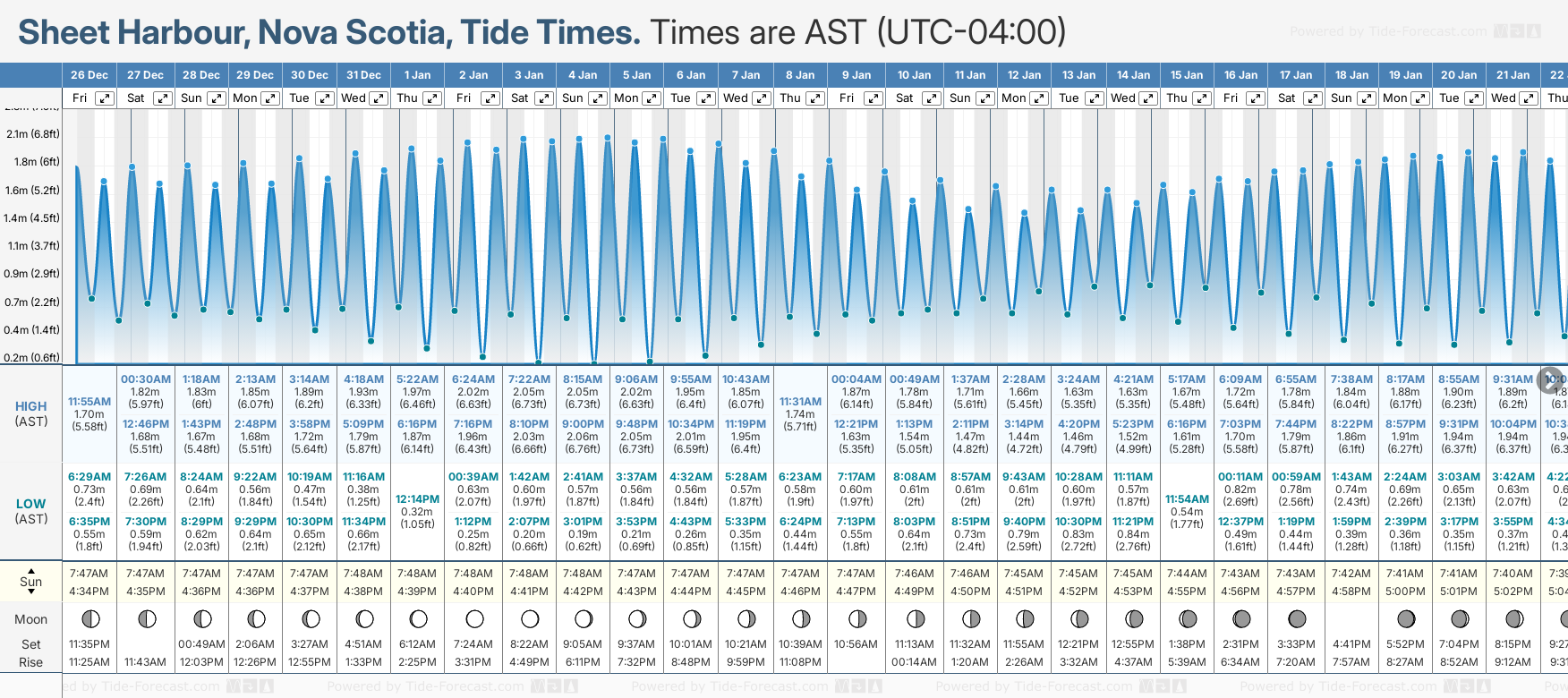 Tide Times are AST (UTC -4.0hrs). Last Spring High Tide at Sheet Harbour was on Mon 22 Dec (height: 1.83m 6.0ft). Next high Spring Tide at Sheet Harbour will be on Sun 04 Jan (height: 2.06m 6.8ft).