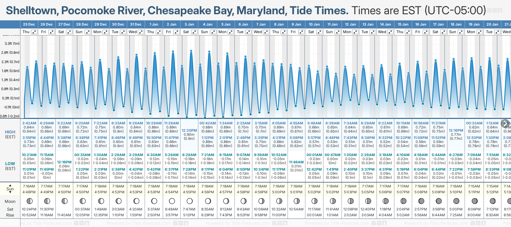 December and January Tide charts for Shelltown, Pocomoke River, Chesapeake Bay: The tide charts below show the height, time and date of high and low tides for the next 30 days.