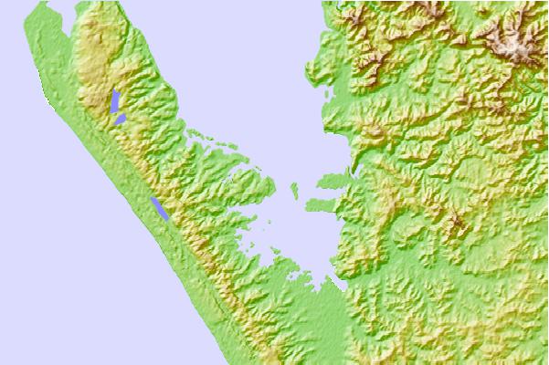 Use this relief map to navigate to tide stations, surf breaks and cities that are in the area of Shelly Beach, New Zealand.