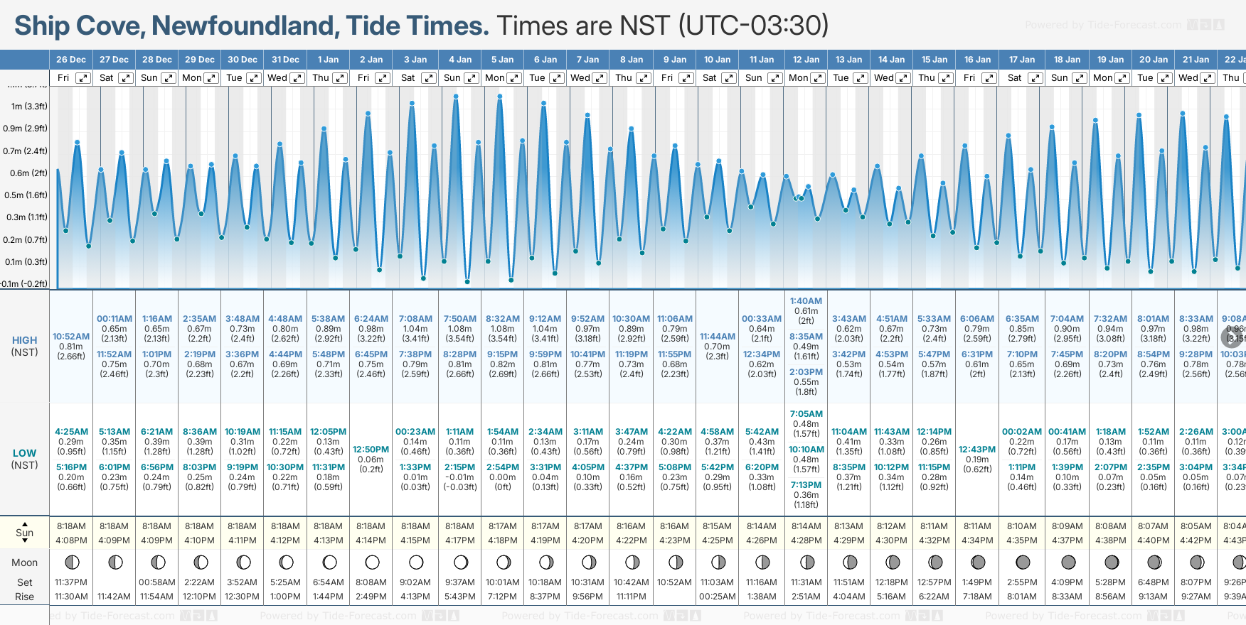 Tide Times are NST (UTC -3.5hrs). Last Spring High Tide at Ship Cove was on Tue 23 Dec (height: 0.93m 3.1ft). Next high Spring Tide at Ship Cove will be on Sun 04 Jan (height: 1.08m 3.5ft).