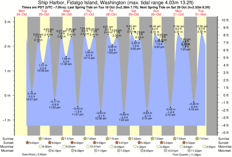 Tide Times are PST (UTC -8.0hrs). Last Spring High Tide at Ship Harbor, Fidalgo Island was on Fri 05 Dec (height: 2.83m 9.3ft). Next high Spring Tide at Ship Harbor, Fidalgo Island will be on Fri 26 Dec (height: 2.65m 8.7ft).