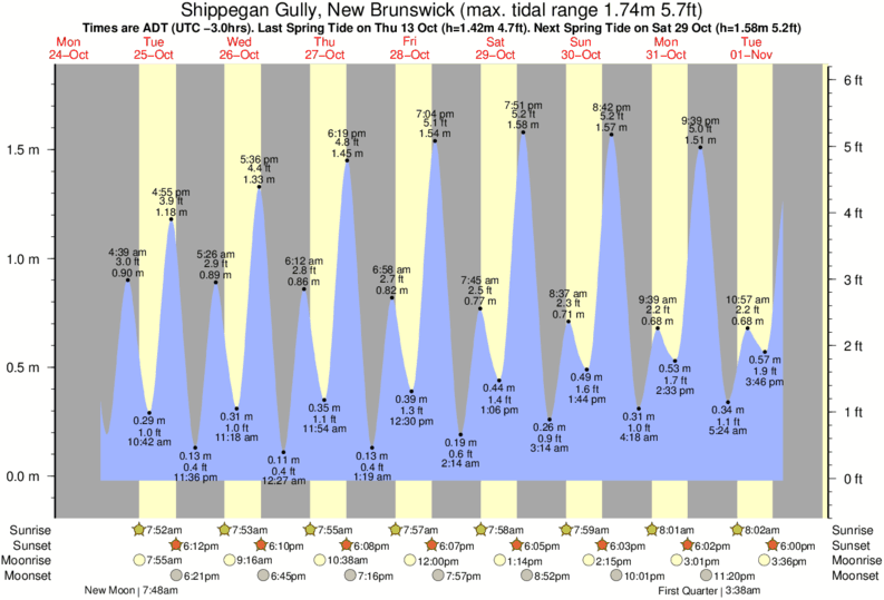 Shippegan Gully tide chart key: The tide chart above shows the height and times of high tide and low tide for Shippegan Gully, New Brunswick. The grey shading corresponds to nighttime hours between sunset and sunrise at Shippegan Gully.
