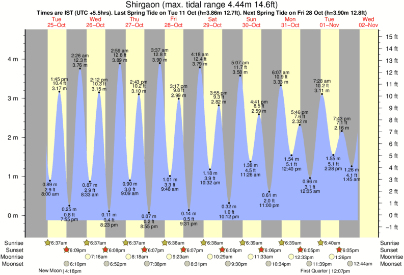 Tide Times are IST (UTC +5.5hrs). Last Spring High Tide at Shirgaon was on Sun 21 Dec (height: 3.69m 12.1ft). Next high Spring Tide at Shirgaon will be on Sun 04 Jan (height: 4.25m 13.9ft).