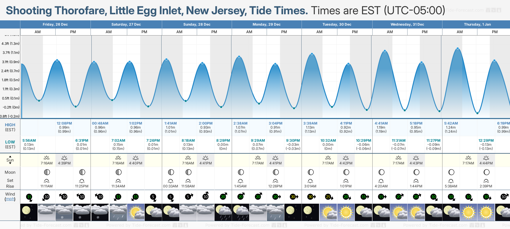 Tide Times are EST (UTC -5.0hrs). Last Spring High Tide at Shooting Thorofare, Little Egg Inlet was on Sat 20 Dec (height: 1.14m 3.7ft). Next high Spring Tide at Shooting Thorofare, Little Egg Inlet will be on Sat 03 Jan (height: 1.32m 4.3ft).