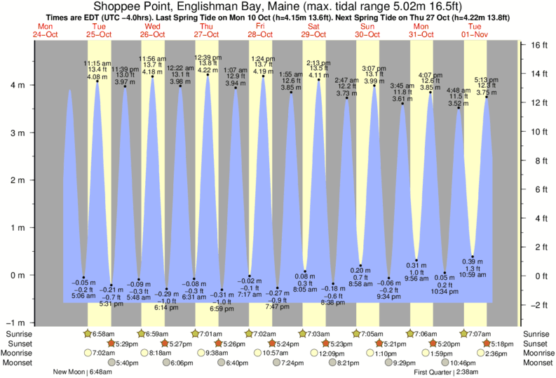 Shoppee Point, Englishman Bay tide chart key: The tide chart above shows the height and times of high tide and low tide for Shoppee Point, Englishman Bay, Maine. The grey shading corresponds to nighttime hours between sunset and sunrise at Shoppee Point, Englishman Bay.