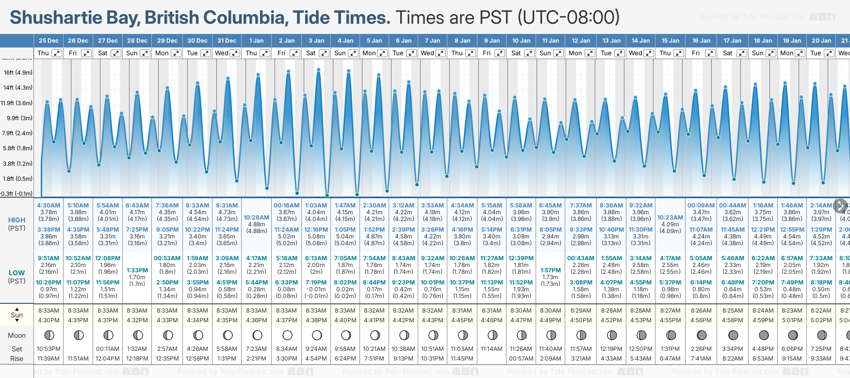 December and January Tide charts for Shushartie Bay: The tide charts below show the height, time and date of high and low tides for the next 30 days.