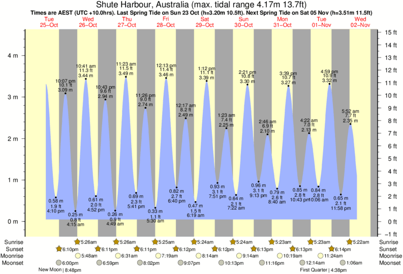Tide Times are AEST (UTC +10.0hrs). Last Spring High Tide at Shute Harbour was on Fri 05 Dec (height: 3.98m 13.1ft). Next high Spring Tide at Shute Harbour will be on Sun 21 Dec (height: 3.44m 11.3ft).