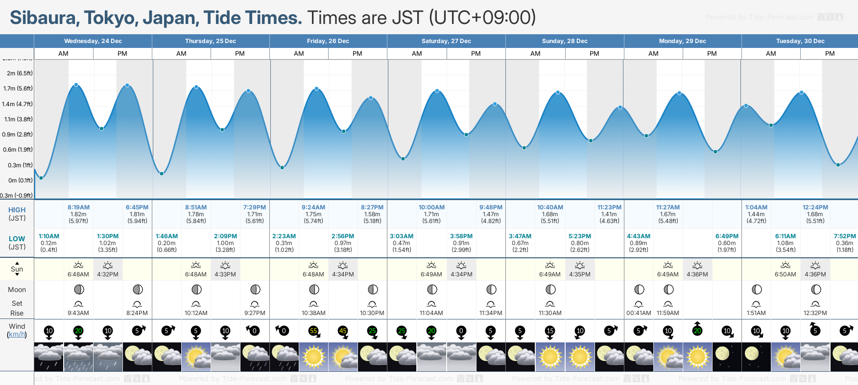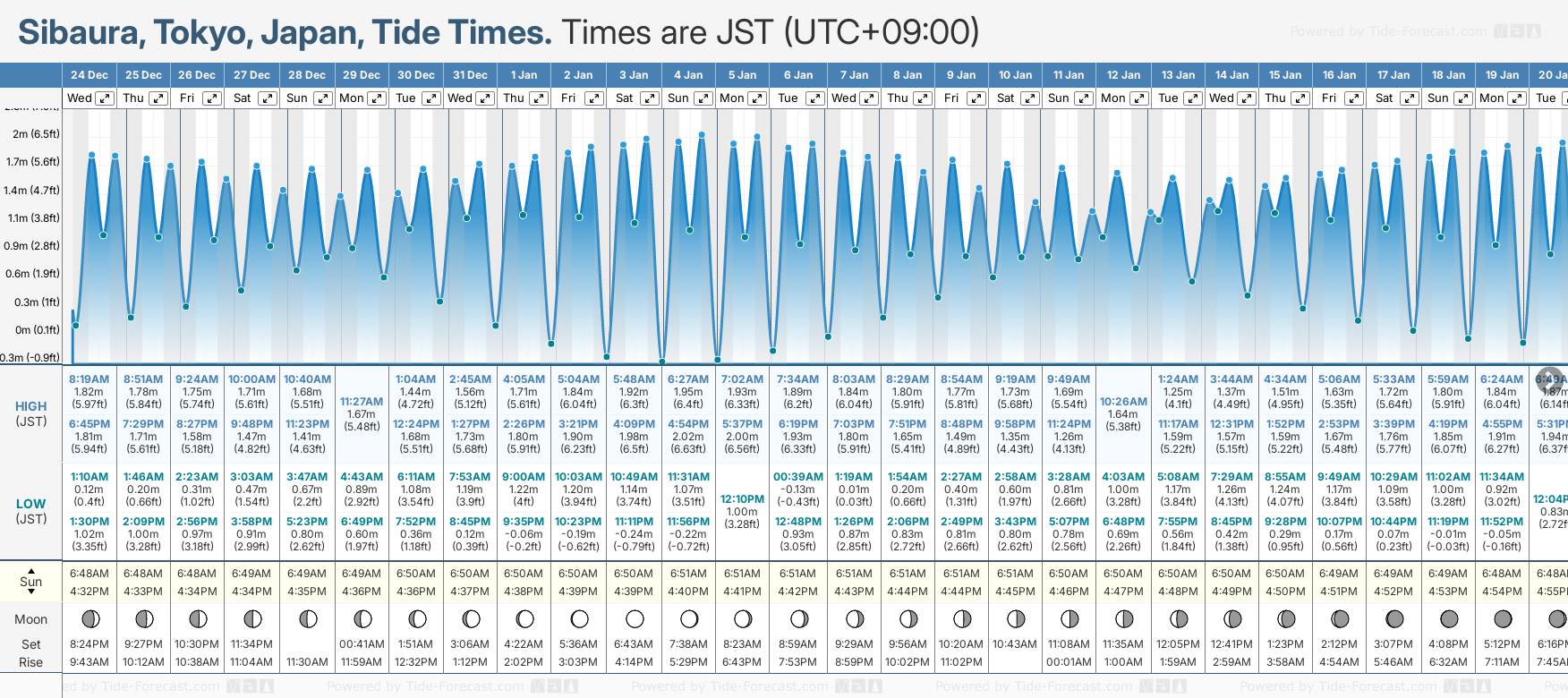 Tide Times are JST (UTC +9.0hrs). Last Spring High Tide at Sibaura was on Mon 22 Dec (height: 1.92m 6.3ft). Next high Spring Tide at Sibaura will be on Mon 05 Jan (height: 2.02m 6.6ft).