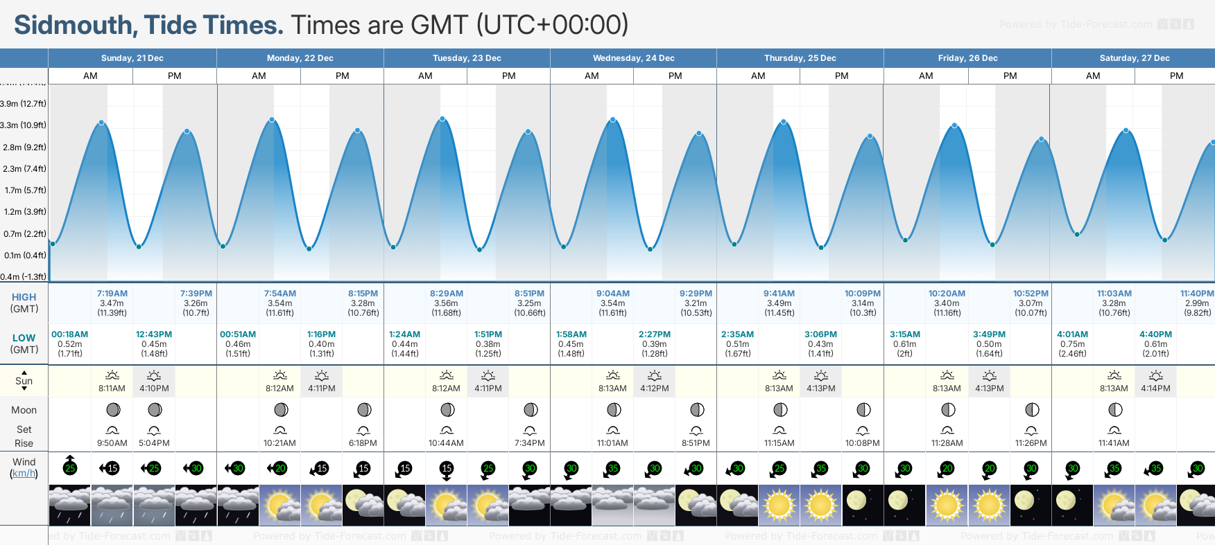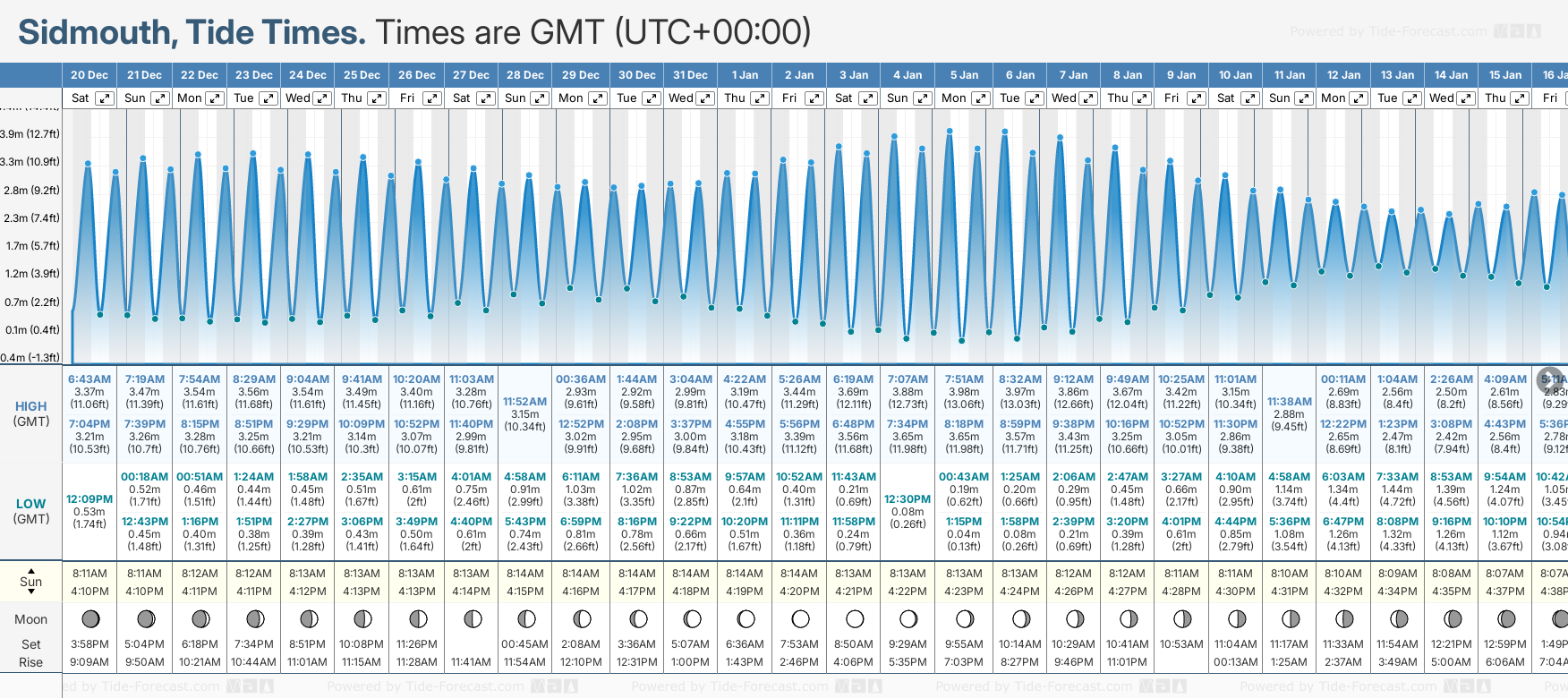 December and January Tide charts for Sidmouth: The tide charts below show the height, time and date of high and low tides for the next 30 days.