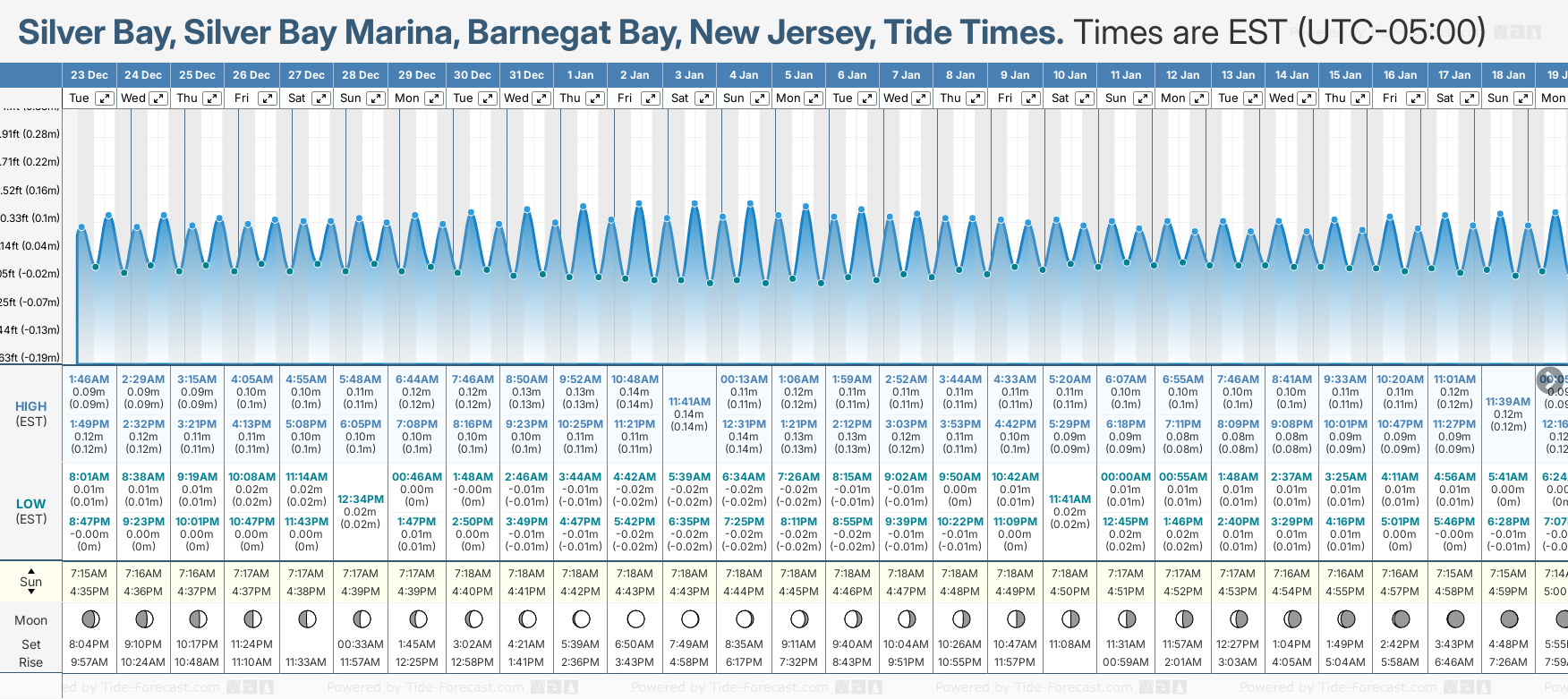 December and January Tide charts for Silver Bay, Silver Bay Marina, Barnegat Bay: The tide charts below show the height, time and date of high and low tides for the next 30 days.