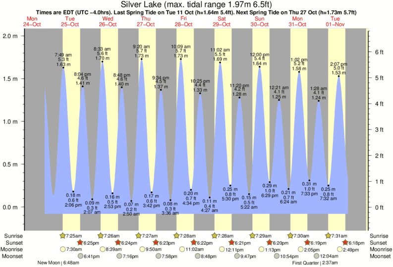 Tide Times are EST (UTC -5.0hrs). Last Spring High Tide at Silver Lake was on Fri 05 Dec (height: 1.89m 6.2ft). Next high Spring Tide at Silver Lake will be on Sun 21 Dec (height: 1.58m 5.2ft).