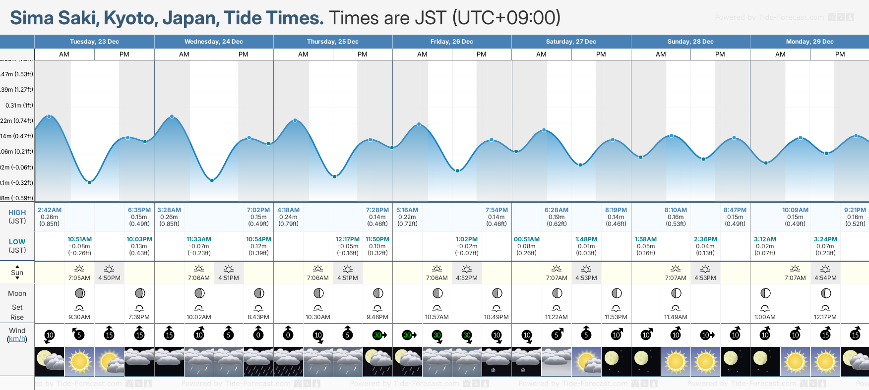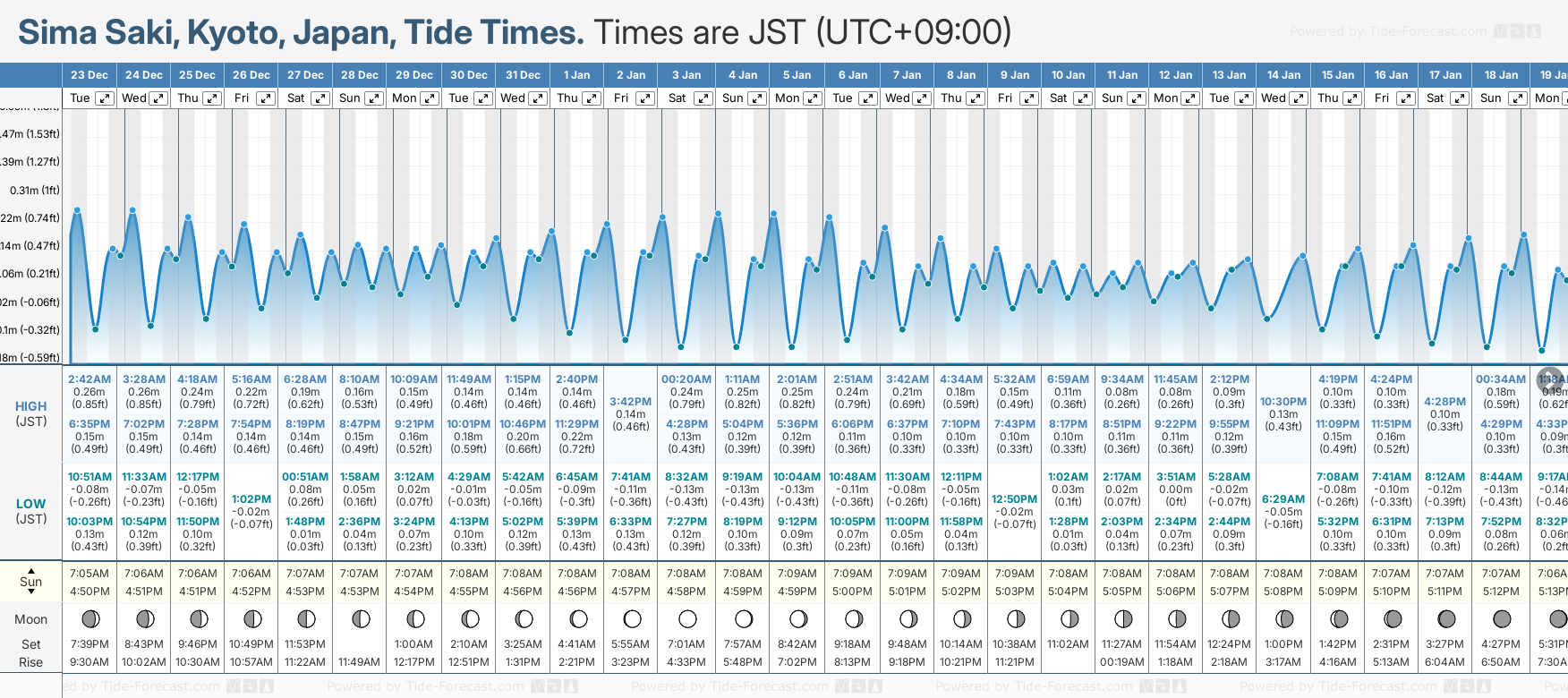 December and January Tide charts for Sima Saki: The tide charts below show the height, time and date of high and low tides for the next 30 days.