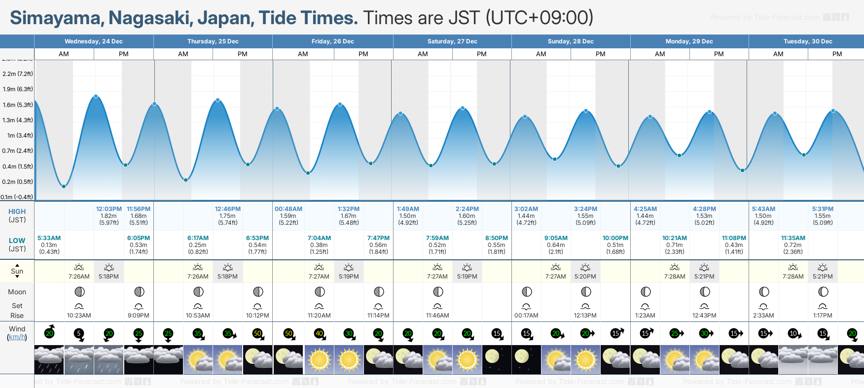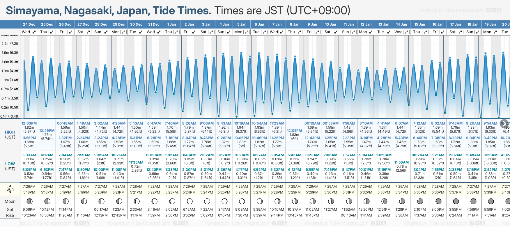 December and January Tide charts for Simayama: The tide charts below show the height, time and date of high and low tides for the next 30 days.
