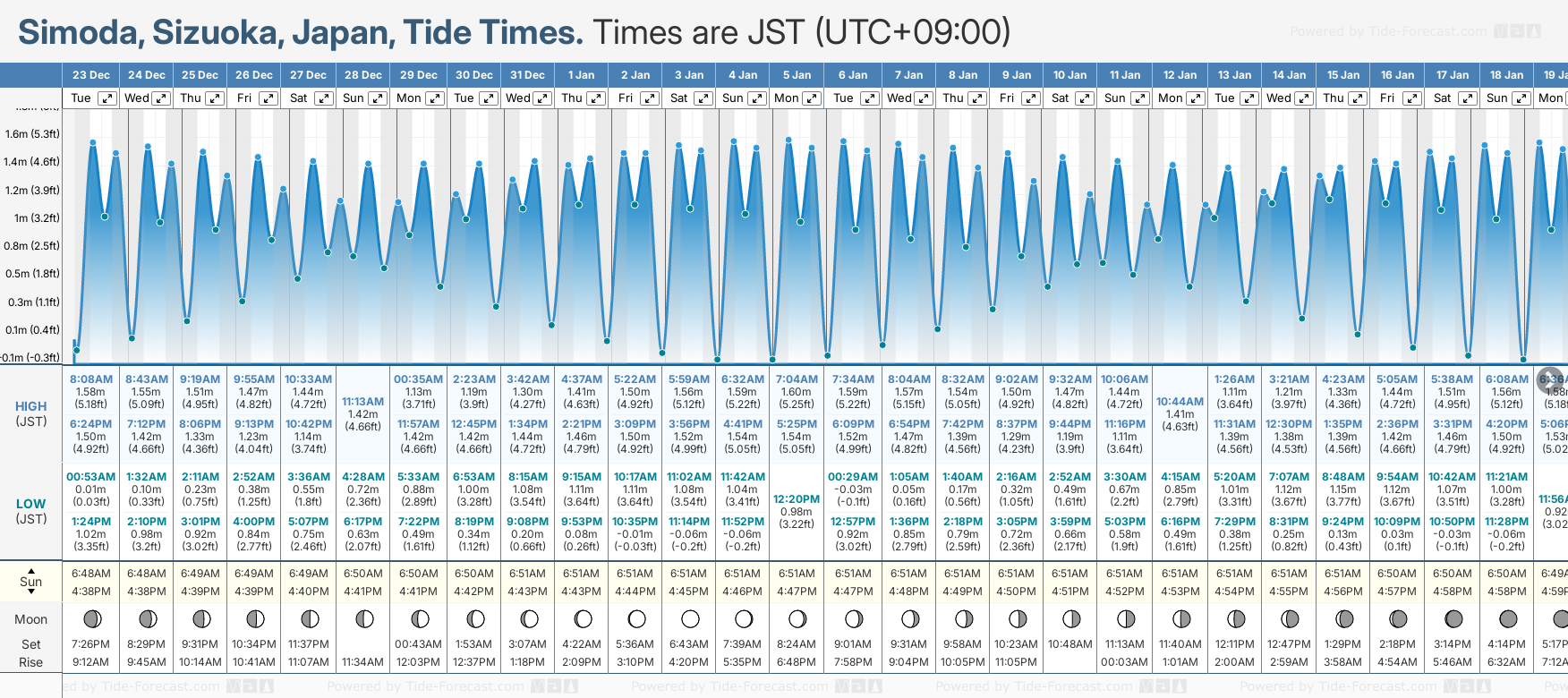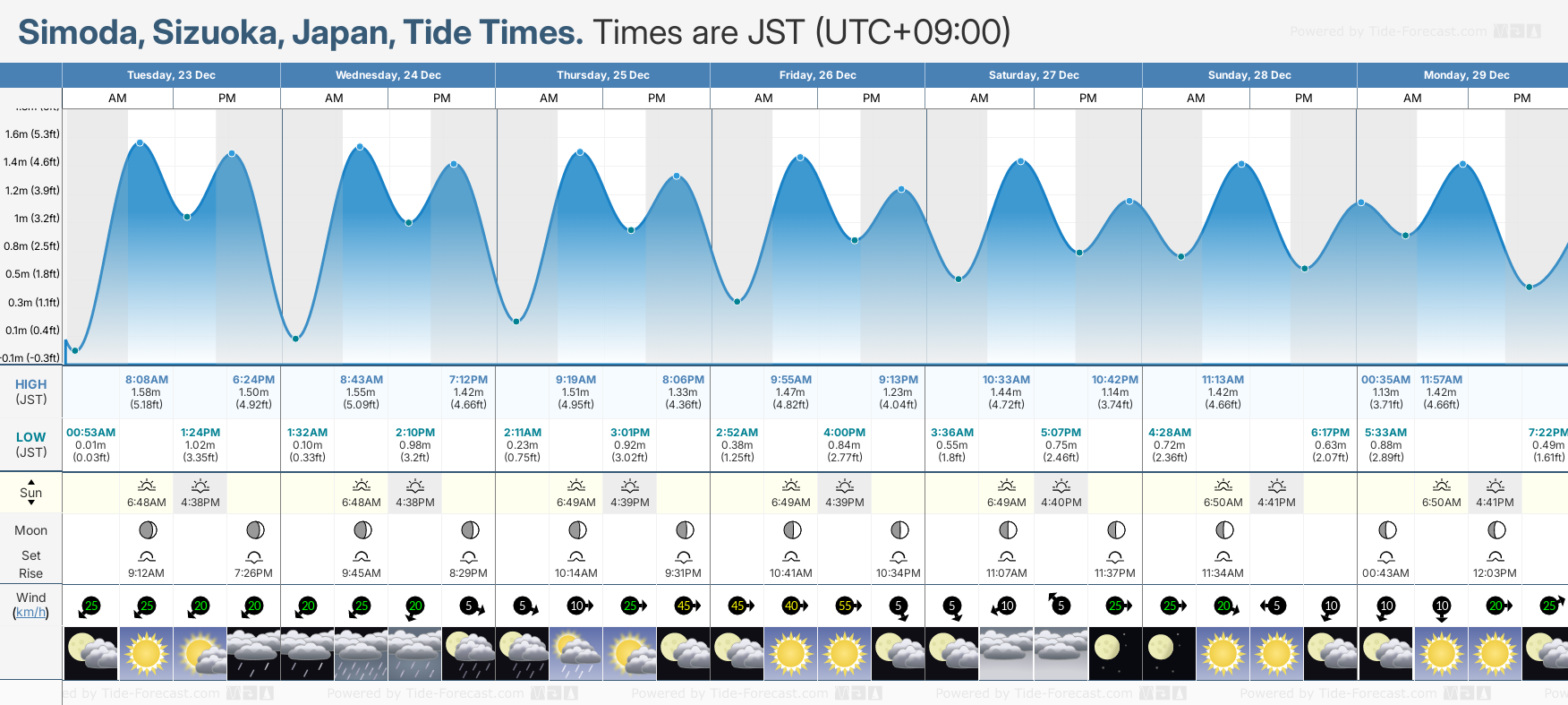 Tide Times are JST (UTC +9.0hrs). Last Spring High Tide at Simoda was on Sun 21 Dec (height: 1.61m 5.3ft). Next high Spring Tide at Simoda will be on Mon 05 Jan (height: 1.60m 5.2ft).
