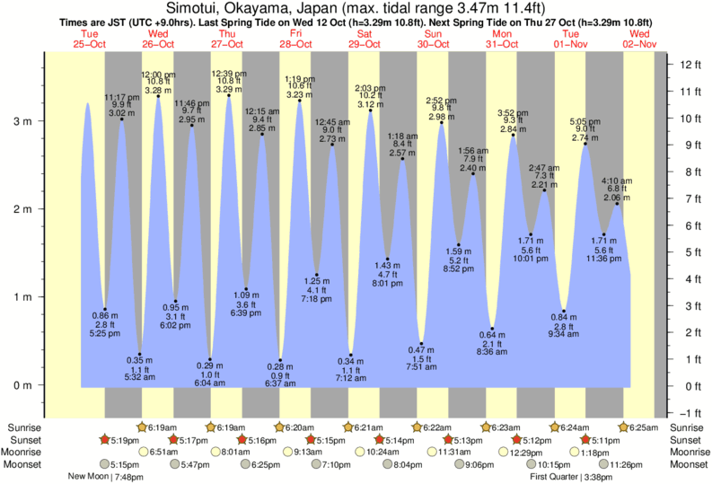 Simotui tide chart key: The tide chart above shows the height and times of high tide and low tide for Simotui, Okayama, Japan. The grey shading corresponds to nighttime hours between sunset and sunrise at Simotui.