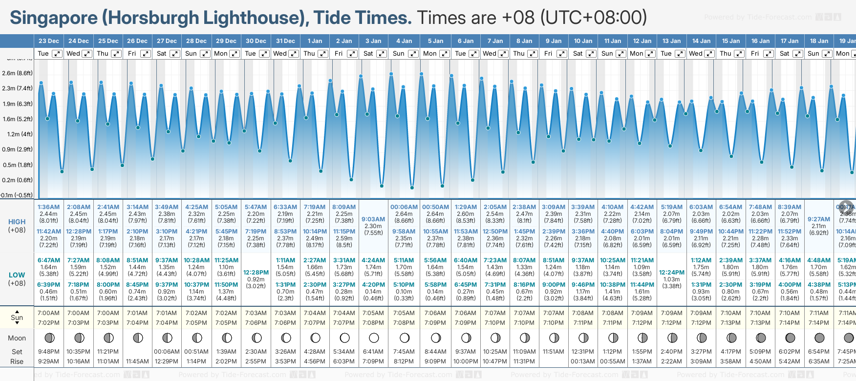 Tide chart for Singapore (Horsburgh Lighthouse)Showing low and high tide times for the next 30 days at Singapore (Horsburgh Lighthouse). Tide Times are +08 (UTC +8.0hrs).