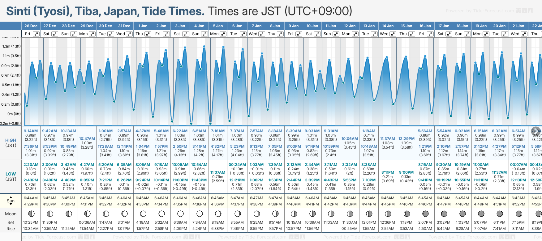 Tide Times are JST (UTC +9.0hrs). Last Spring High Tide at Sinti (Tyosi) was on Mon 22 Dec (height: 1.24m 4.1ft). Next high Spring Tide at Sinti (Tyosi) will be on Mon 05 Jan (height: 1.28m 4.2ft).
