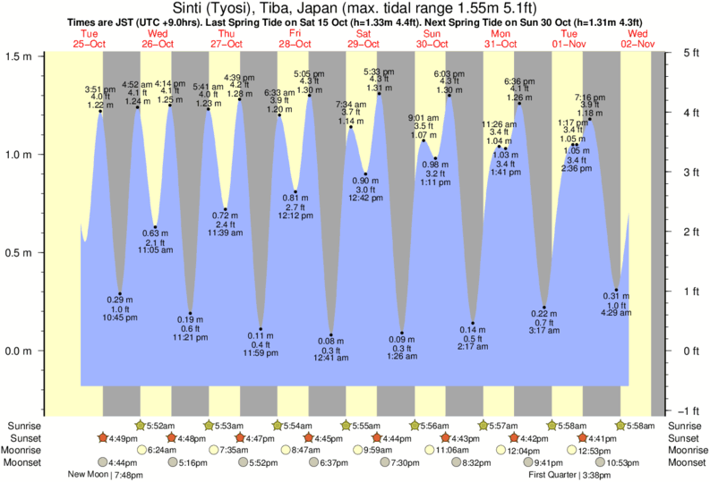 Sinti (Tyosi) tide chart key: The tide chart above shows the height and times of high tide and low tide for Sinti (Tyosi), Tiba, Japan. The grey shading corresponds to nighttime hours between sunset and sunrise at Sinti (Tyosi).