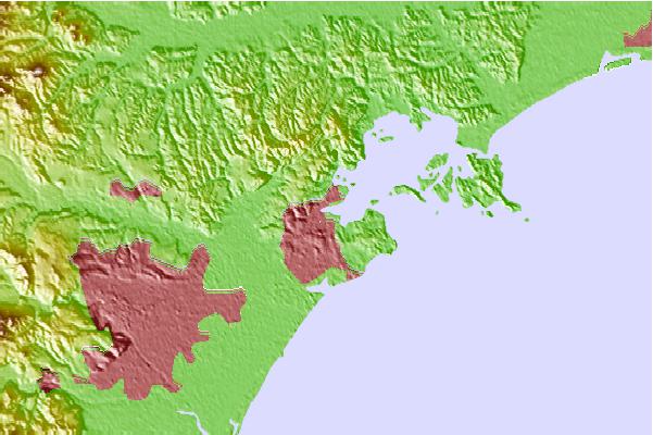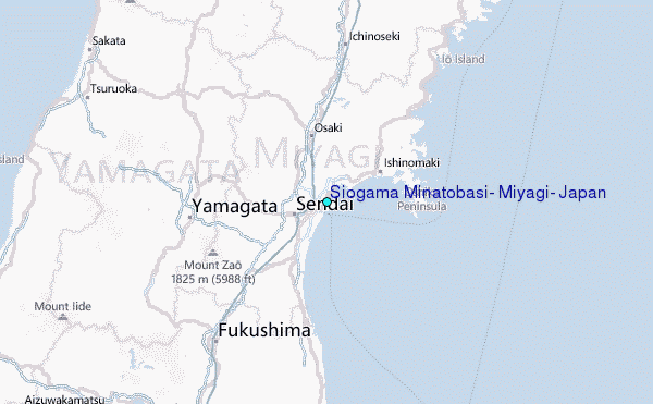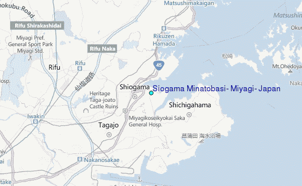 Use this relief map to navigate to tide stations, surf breaks and cities that are in the area of Siogama Minatobasi, Miyagi, Japan.