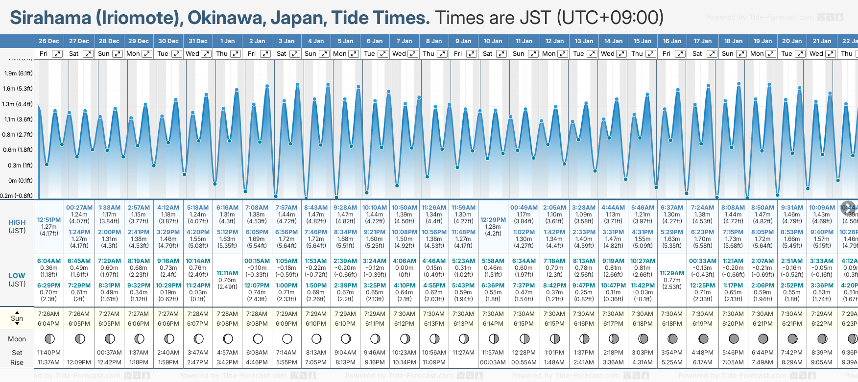December and January Tide charts for Sirahama (Iriomote): The tide charts below show the height, time and date of high and low tides for the next 30 days.