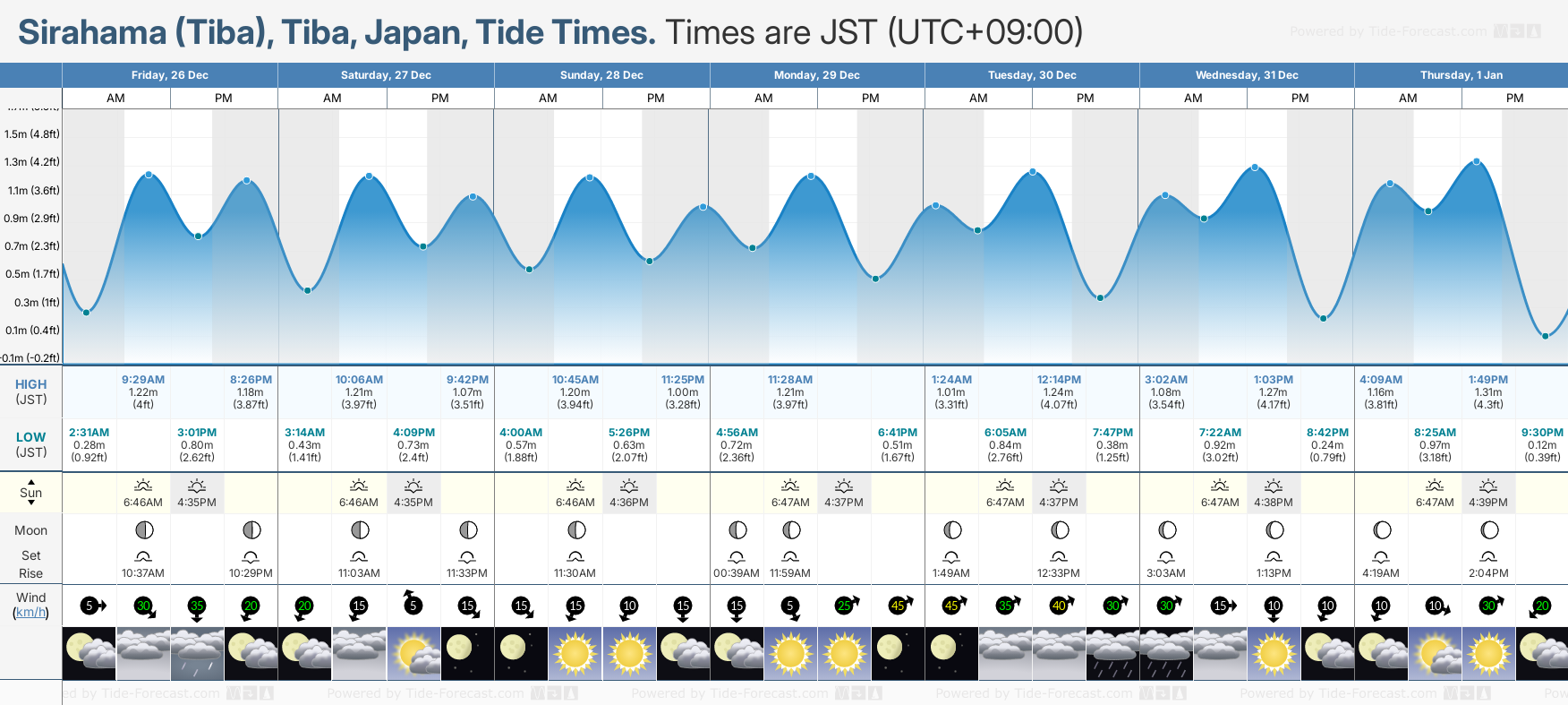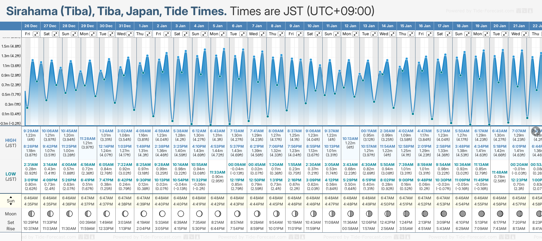 December and January Tide charts for Sirahama (Tiba): The tide charts below show the height, time and date of high and low tides for the next 30 days.