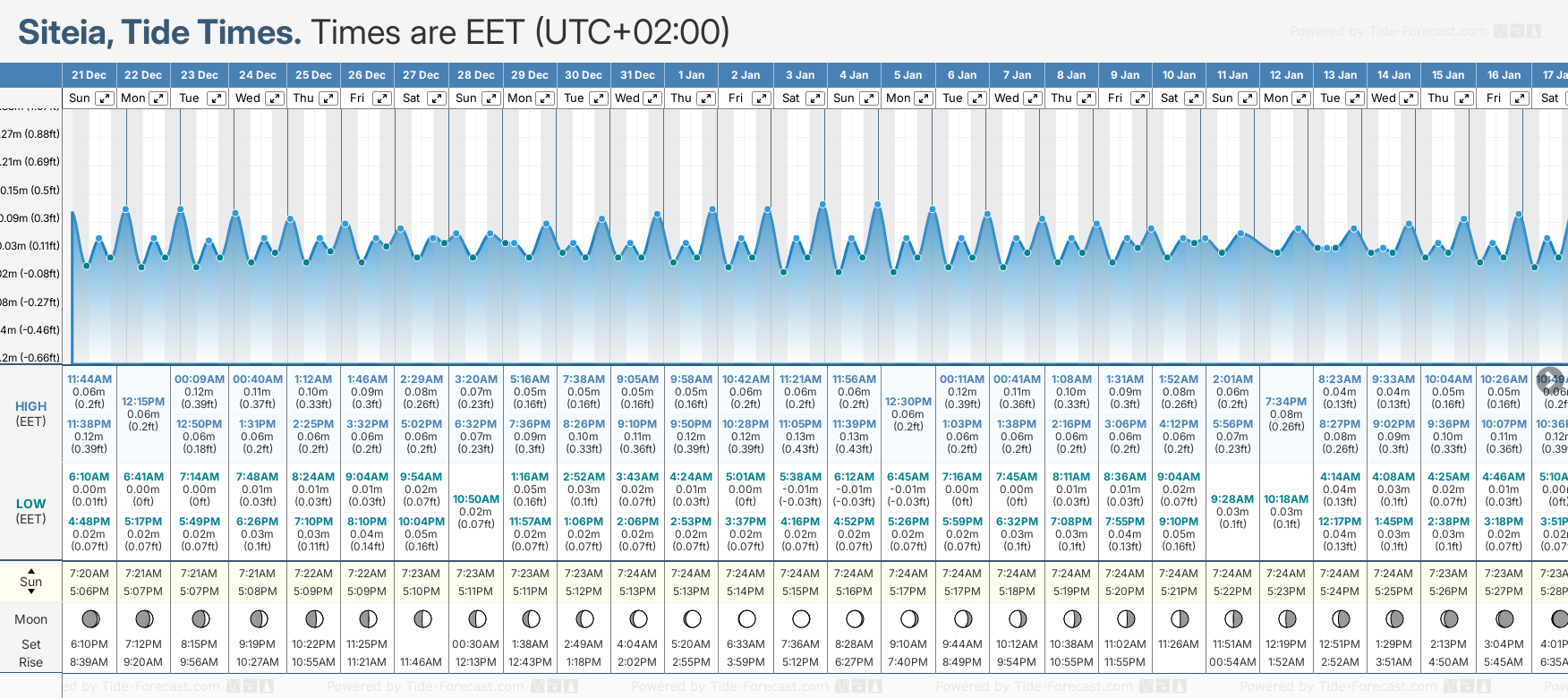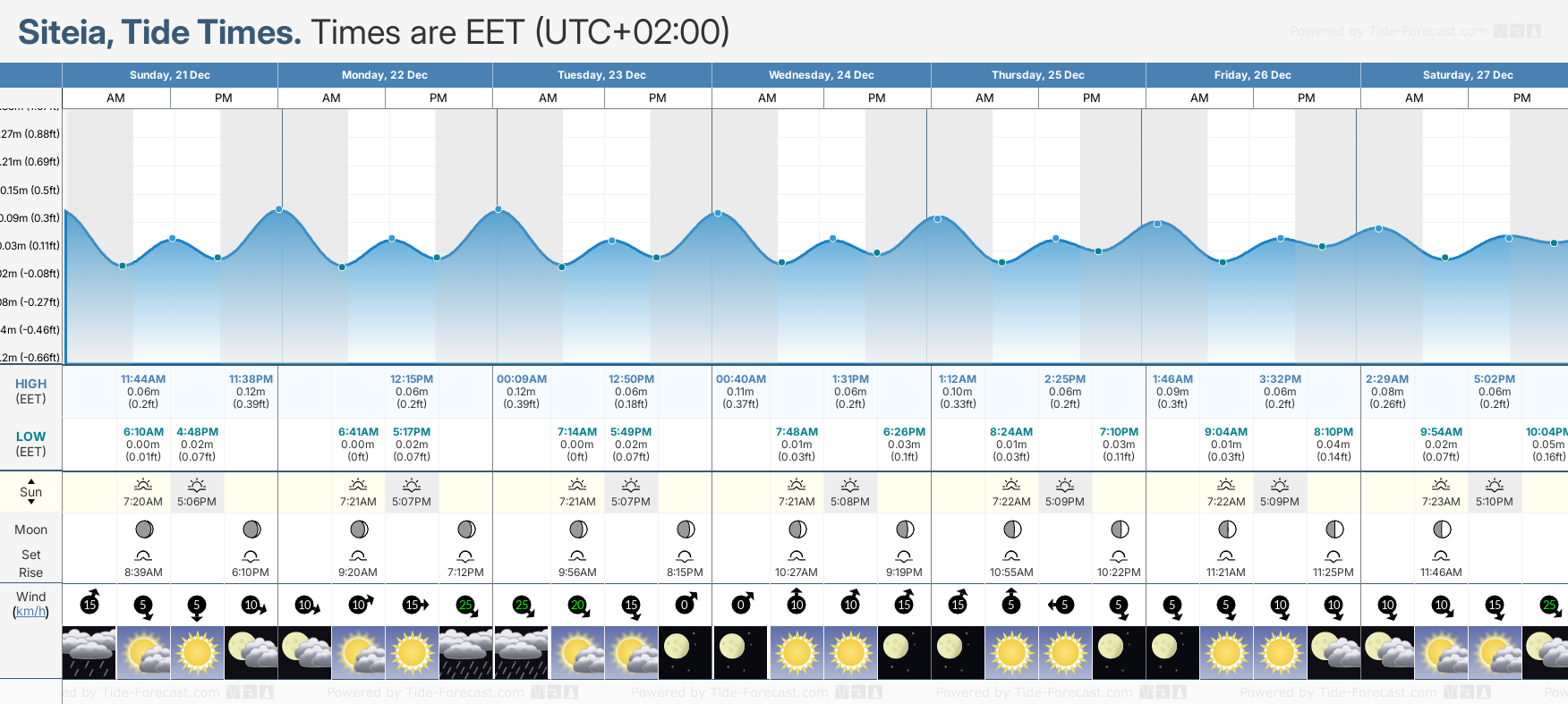 December and January Tide charts for Siteia: The tide charts below show the height, time and date of high and low tides for the next 30 days.