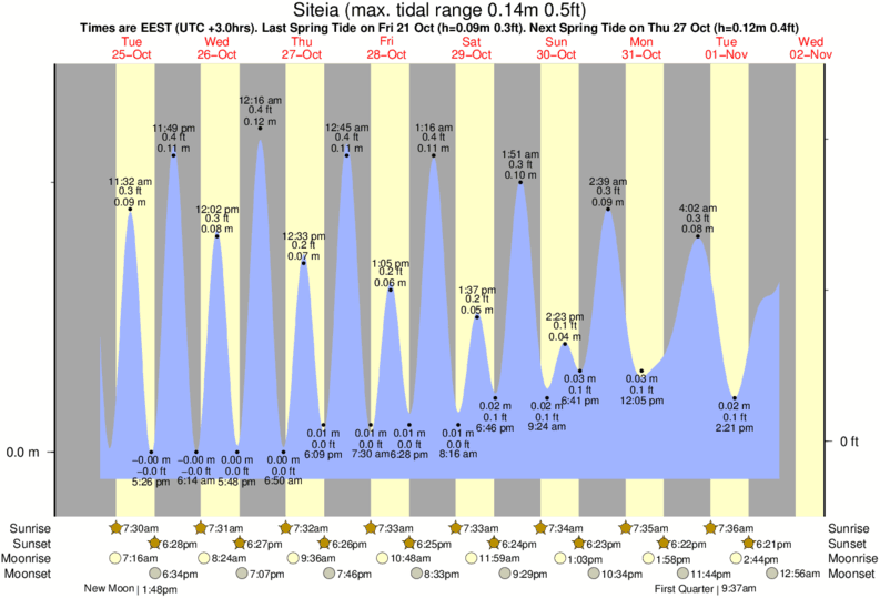 Tide Times are EET (UTC +2.0hrs). Last Spring High Tide at Siteia was on Sat 20 Dec (height: 0.12m 0.4ft). Next high Spring Tide at Siteia will be on Sun 04 Jan (height: 0.13m 0.4ft).