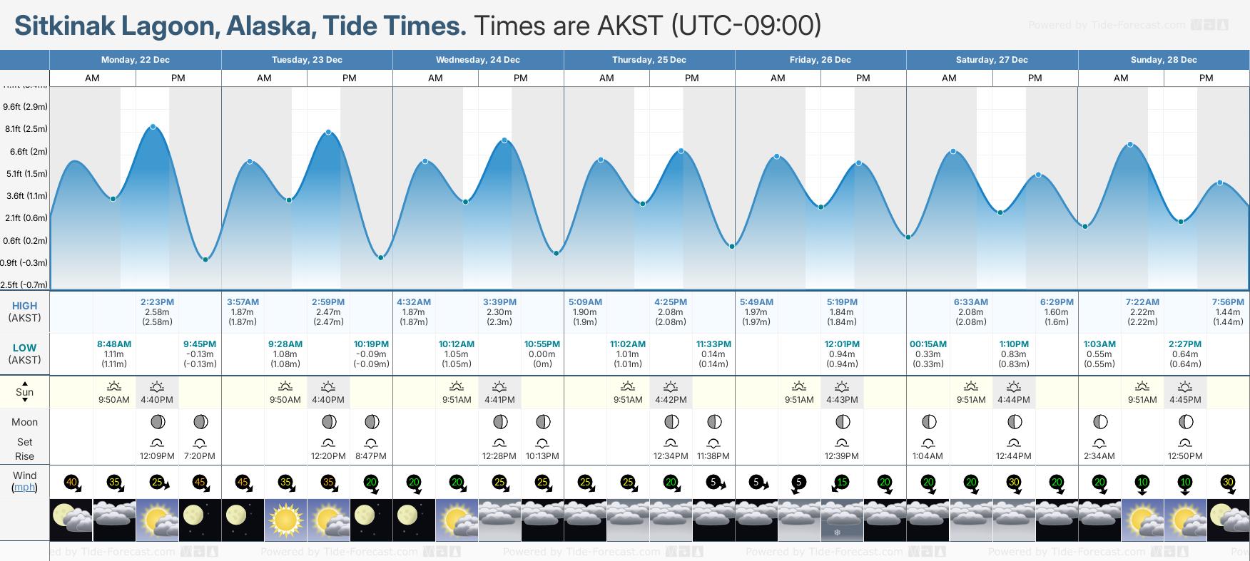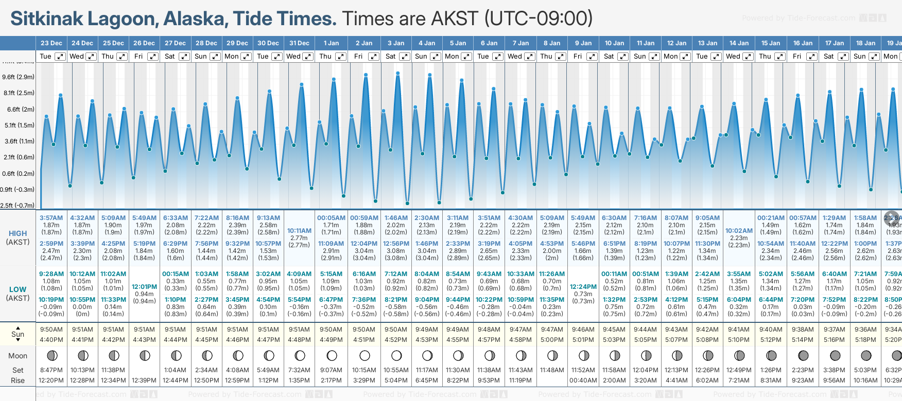 December and January Tide charts for Sitkinak Lagoon: The tide charts below show the height, time and date of high and low tides for the next 30 days.