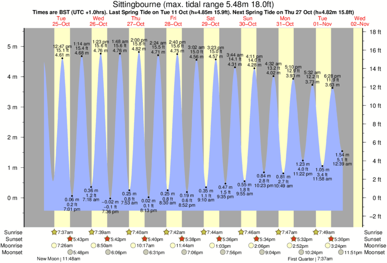 Tide Times are GMT (UTC +0hrs). Last Spring High Tide at Sittingbourne was on Sat 06 Dec (height: 4.90m 16.1ft). Next high Spring Tide at Sittingbourne will be on Tue 23 Dec (height: 4.32m 14.2ft).