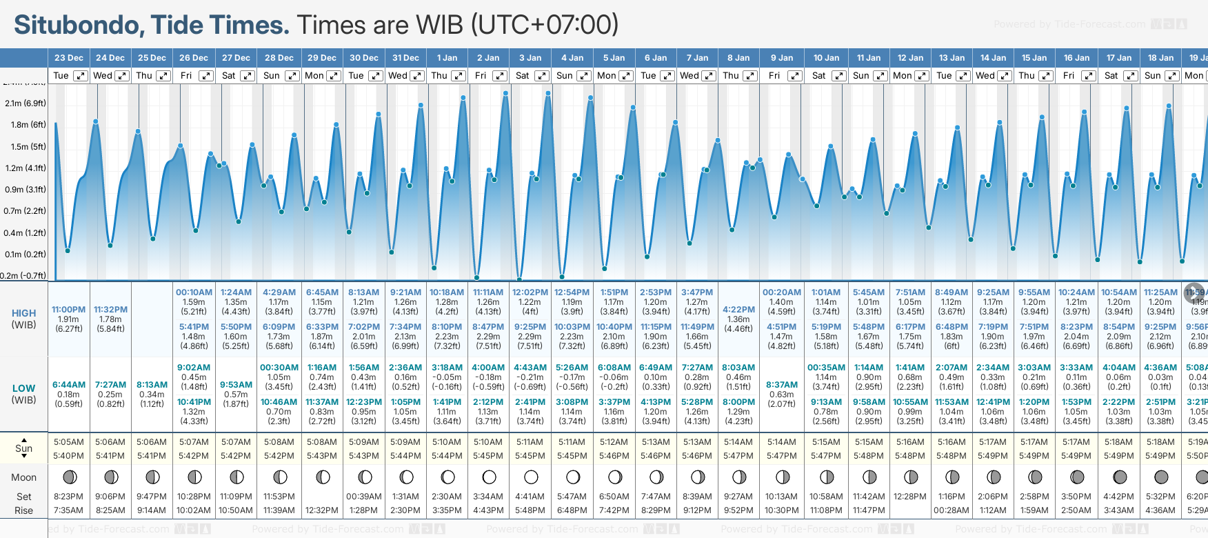 Tide Times are WIB (UTC +7.0hrs). Last Spring High Tide at Situbondo was on Sun 21 Dec (height: 2.07m 6.8ft). Next high Spring Tide at Situbondo will be on Sat 03 Jan (height: 2.29m 7.5ft).