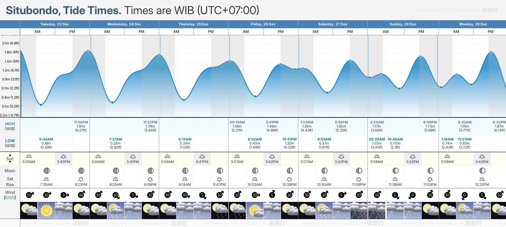Tide chart for SitubondoShowing low and high tide times for the next 30 days at Situbondo. Tide Times are WIB (UTC +7.0hrs).
