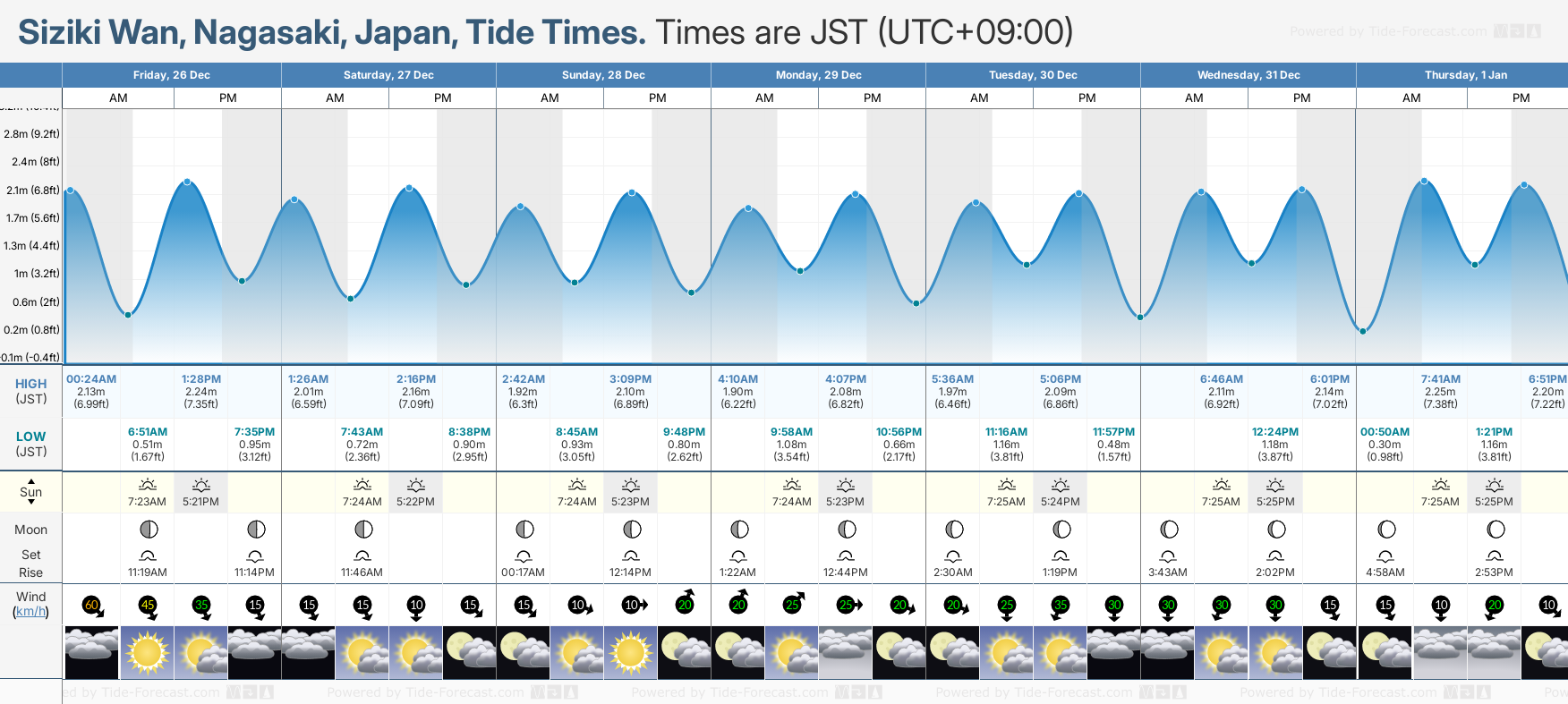 Siziki Wan tide chart key: The tide chart above shows the height and times of high tide and low tide for Siziki Wan, Nagasaki, Japan. The grey shading corresponds to nighttime hours between sunset and sunrise at Siziki Wan.