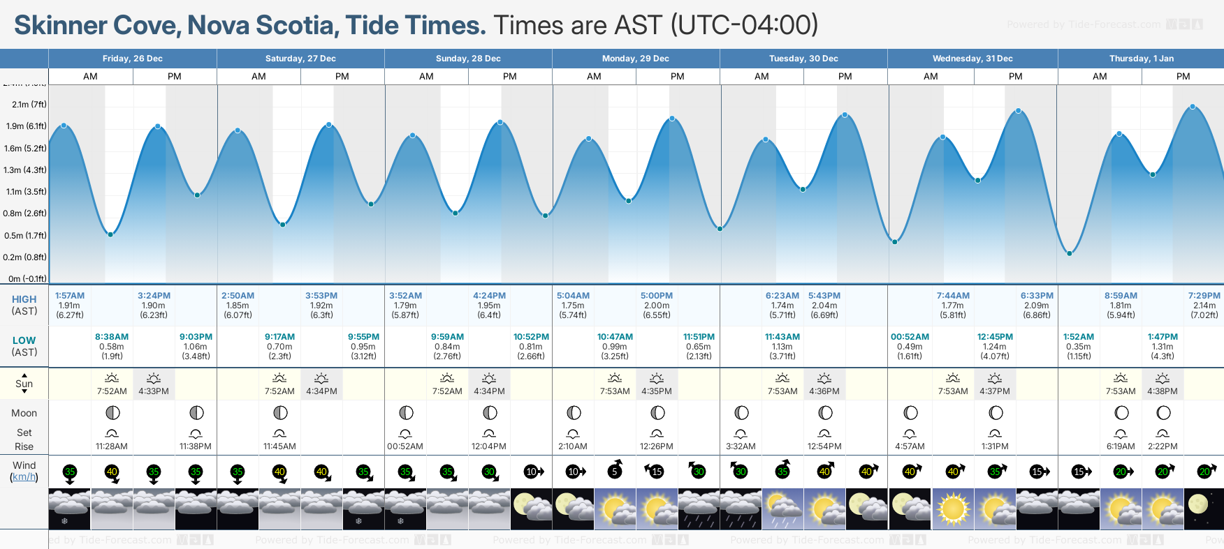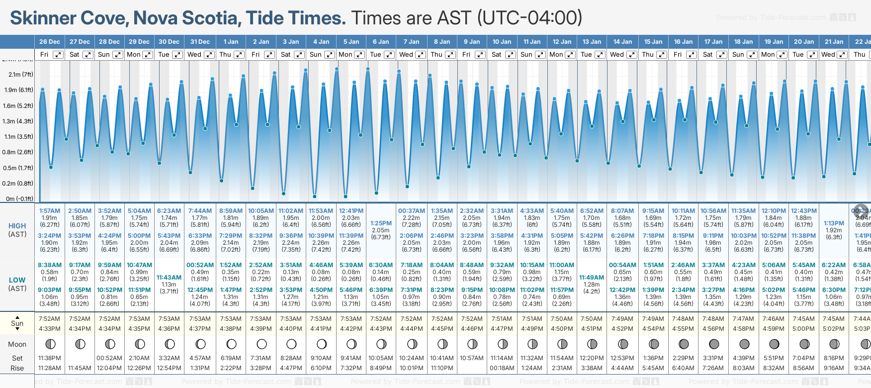 Tide chart for Skinner CoveShowing low and high tide times for the next 30 days at Skinner Cove. Tide Times are AST (UTC -4.0hrs).
