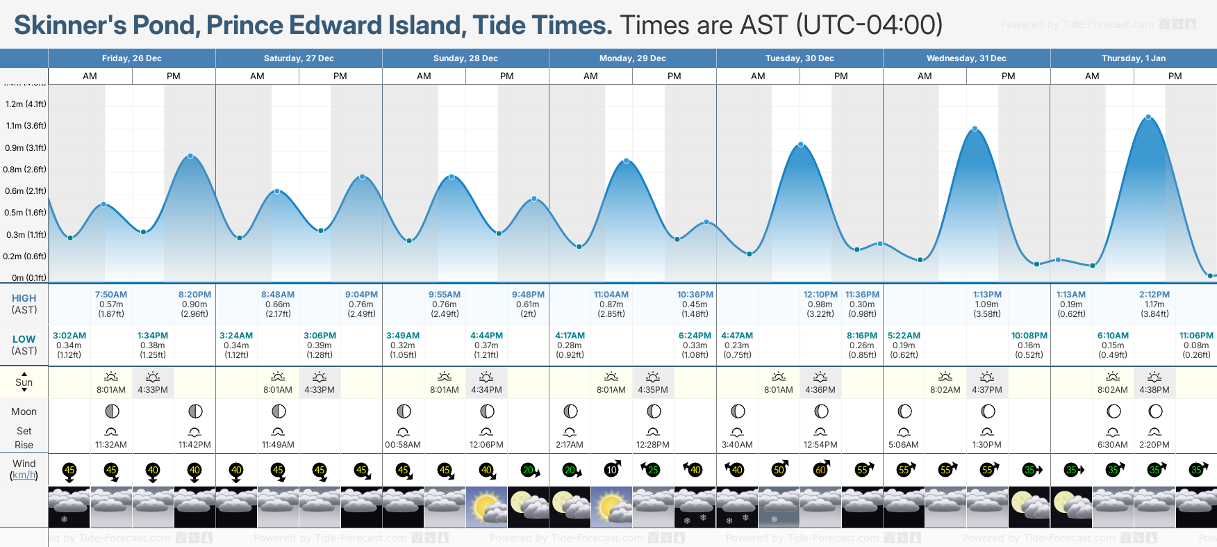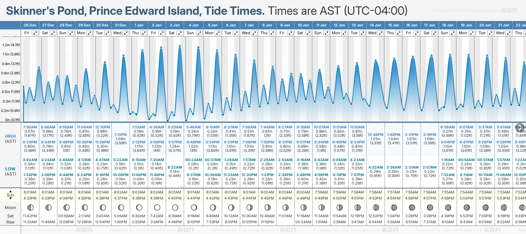 December and January Tide charts for Skinner's Pond: The tide charts below show the height, time and date of high and low tides for the next 30 days.