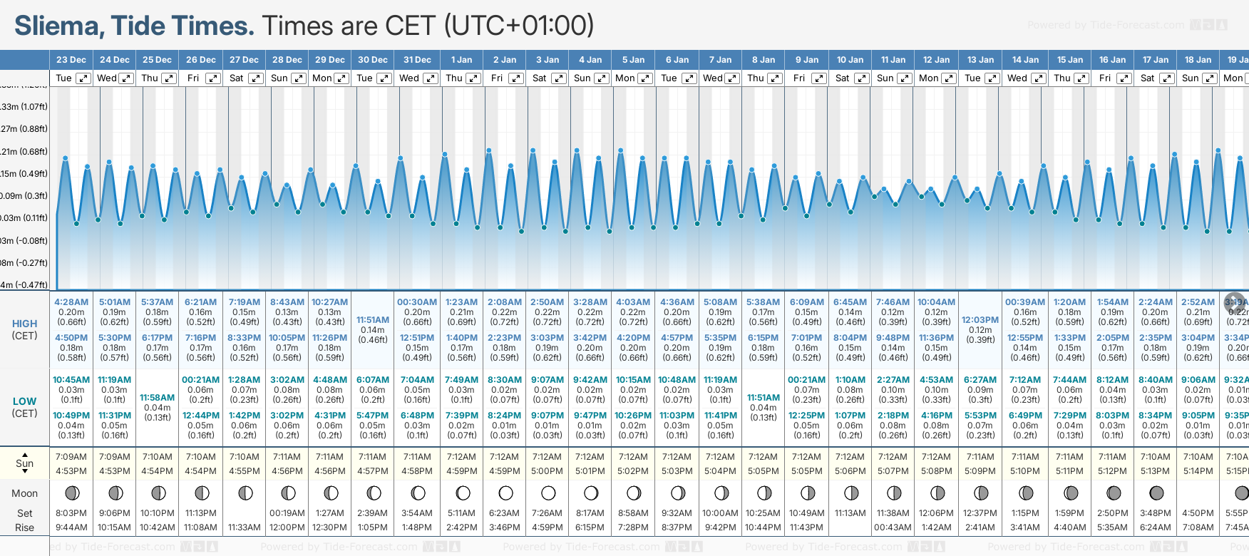 Tide Times are CET (UTC +1.0hrs). Last Spring High Tide at Sliema was on Sun 21 Dec (height: 0.21m 0.7ft). Next high Spring Tide at Sliema will be on Fri 02 Jan (height: 0.22m 0.7ft).
