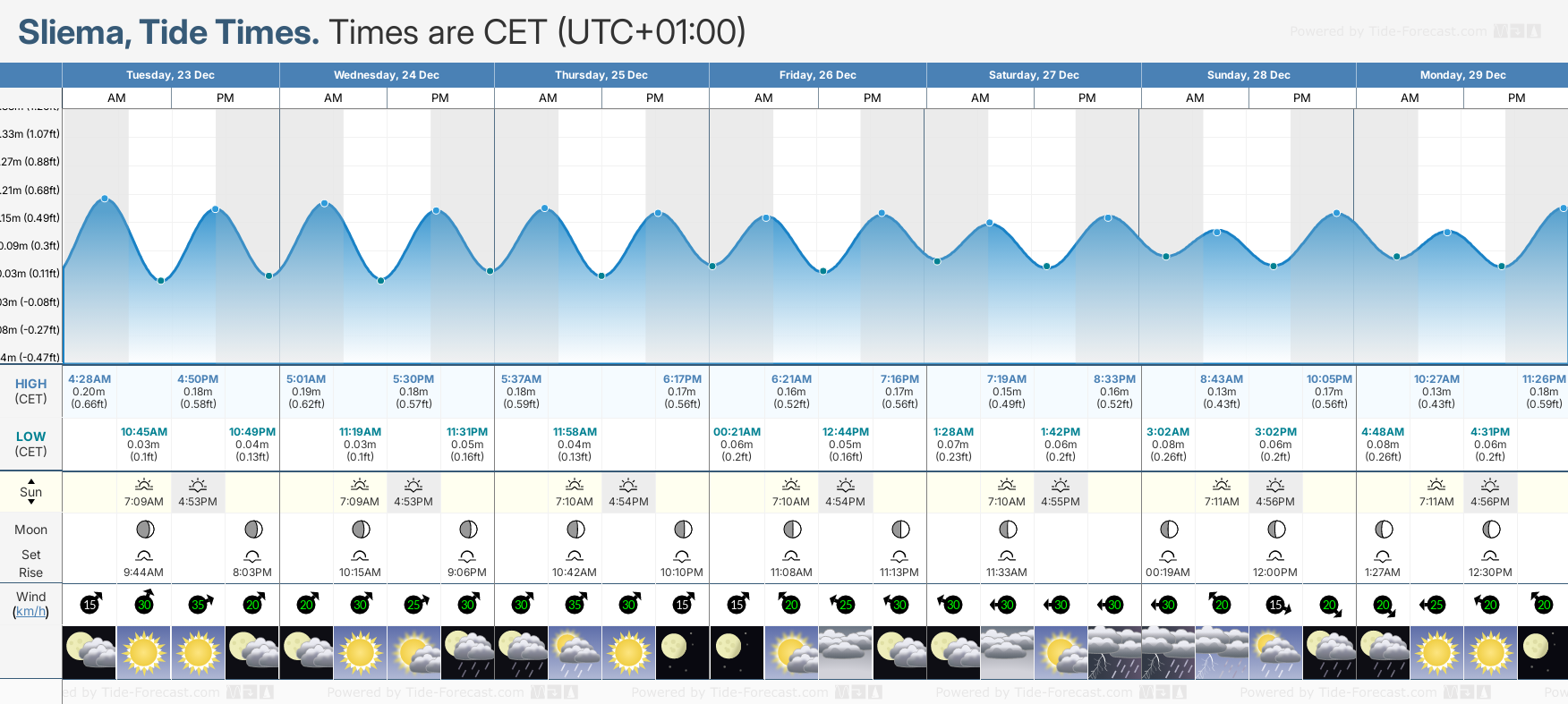 December and January Tide charts for Sliema: The tide charts below show the height, time and date of high and low tides for the next 30 days.