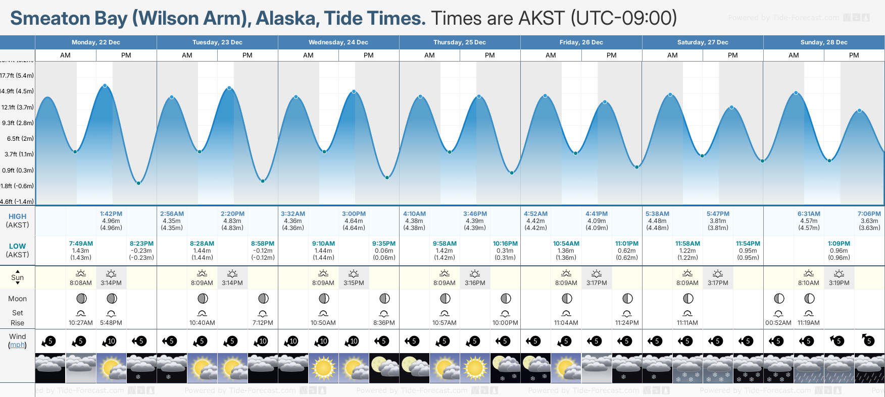 Tide Times are AKST (UTC -9.0hrs). Last Spring High Tide at Smeaton Bay (Wilson Arm) was on Sun 21 Dec (height: 5.01m 16.4ft). Next high Spring Tide at Smeaton Bay (Wilson Arm) will be on Sat 03 Jan (height: 5.76m 18.9ft).